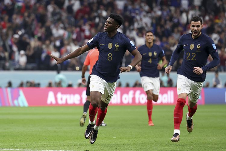 12月10日,法国队球员楚阿梅尼(左)在比赛中进球后庆祝。