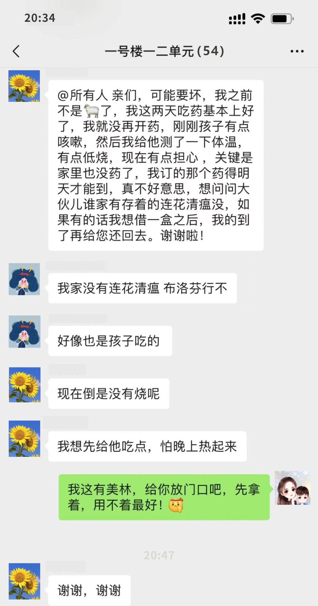 李女士:现在,孩子的状态还挺好的,也不烧了,除了吃得不太多,其他也没有什么别的症状。经过大概5天吧,我也基本好了。其实挺感谢大家的,邻居朋友们知道后有给我发微信、有给我拿药的,我心里感觉特别温暖,也不慌了,非常感谢邻居们的关心,还有我们社区大家庭。现在我的药也到货了,如果谁有需要,我也可以出把力,当然,希望大家都用不到,都平平安安。