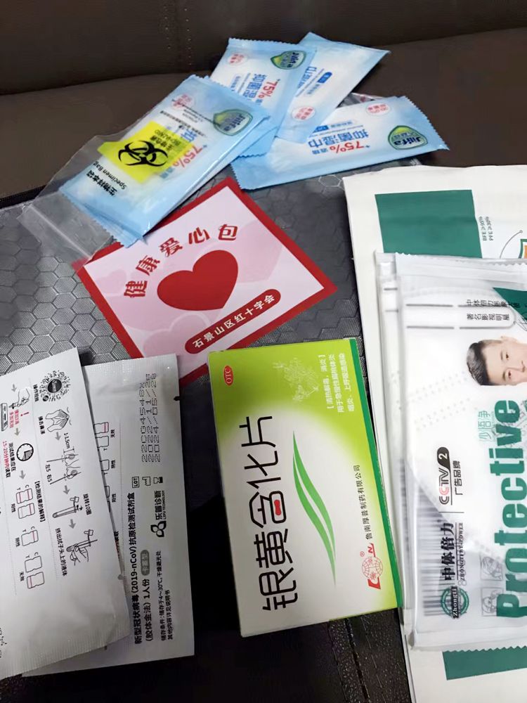 防疫包内有口罩、银黄含化片、酒精抑菌湿巾、抗原试剂盒等防疫物资。