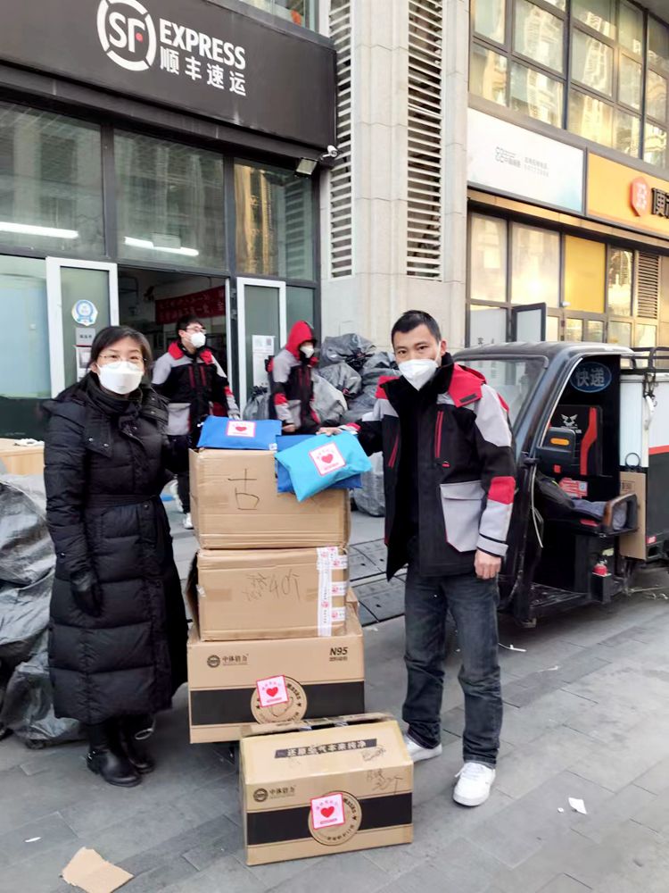 12月14日,快递小哥紧张工作时收到暖心防疫包。