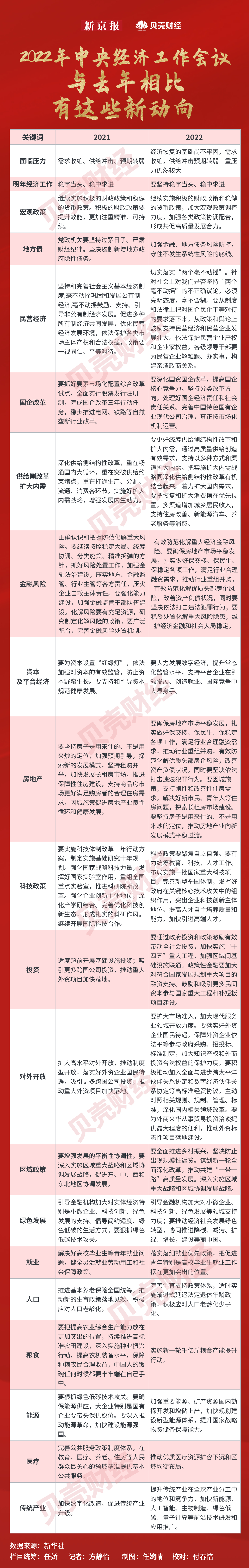 此外,新京报贝壳财经发现多处“重要变化”,和2021年相比,2022年中央经济会议在布局2023年各项“关键领域”方面均有新动向