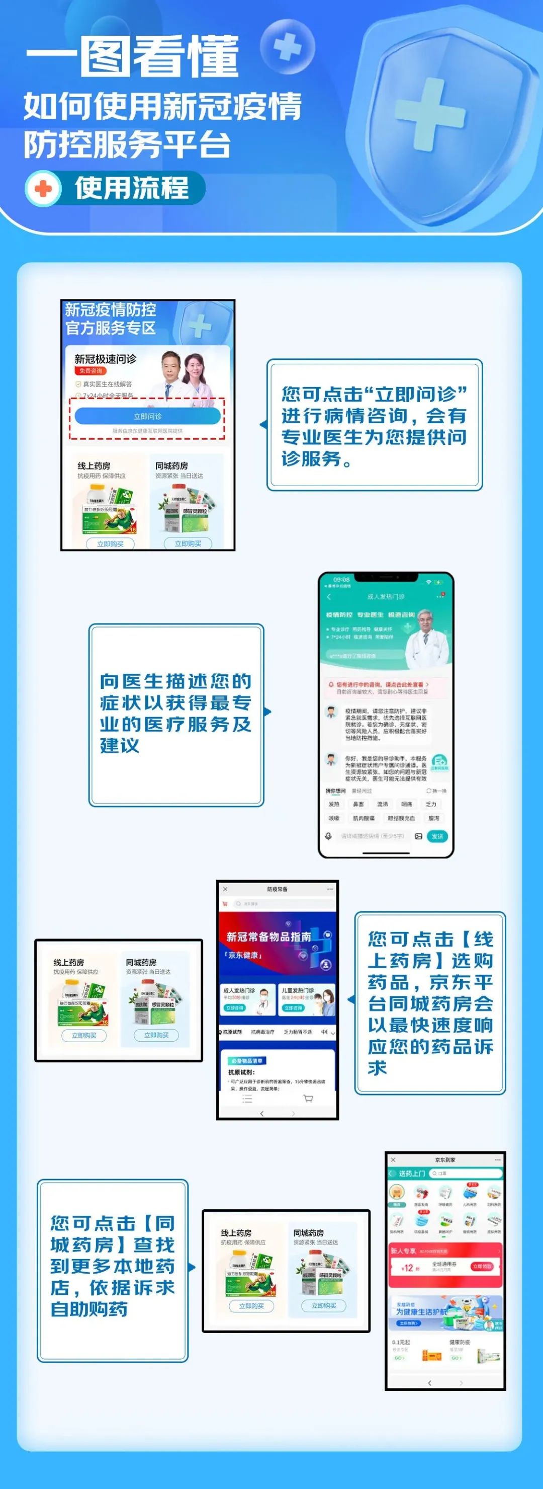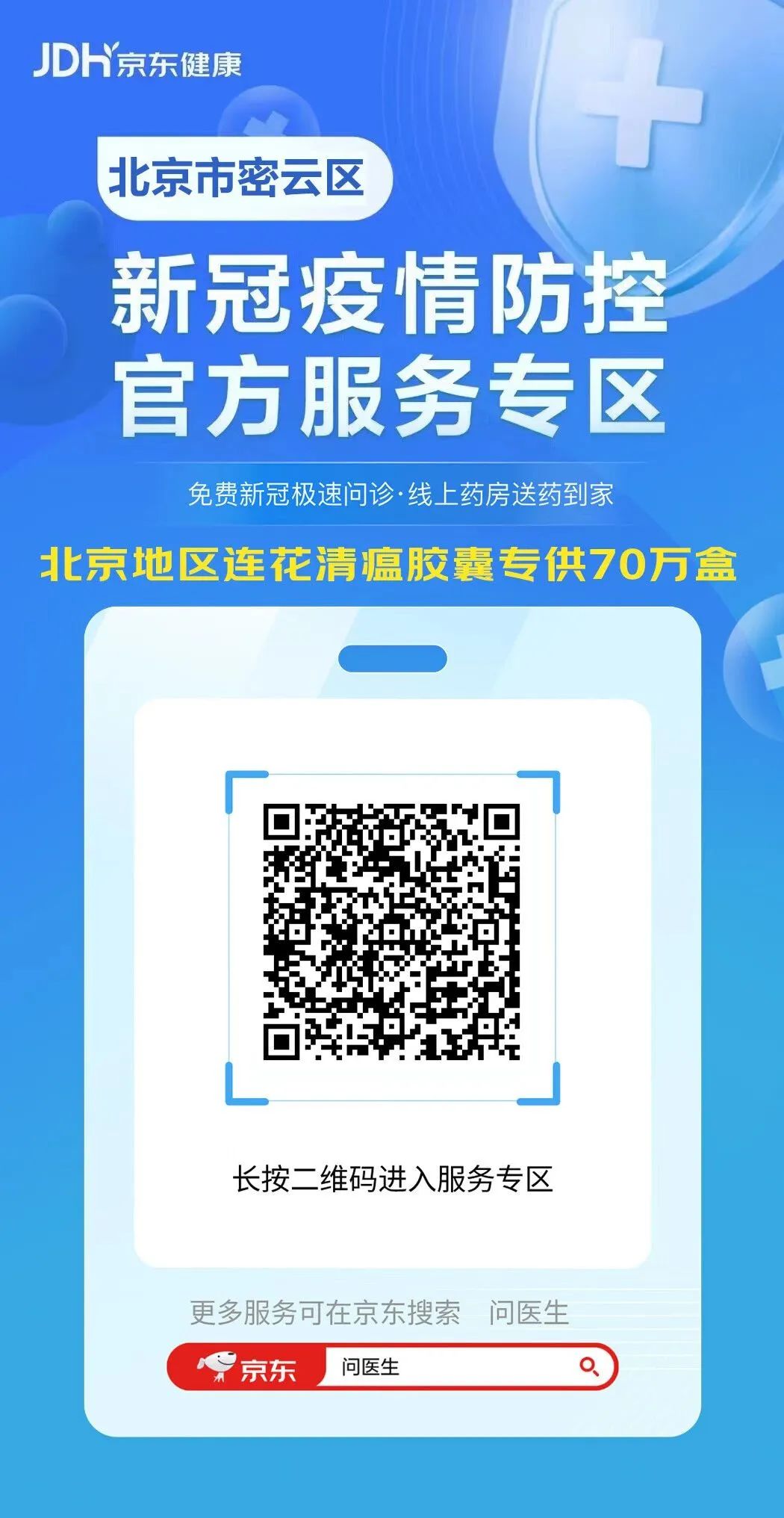 为进一步方便辖区百姓就医,减少前往医院频率,降低感染风险,保障疫情期间网上问诊需求,密云区与京东健康合作,联合开发“密云区新冠疫情防控官方服务专区”,通过该平台7x24小时为居民提供更加便捷的免费线上问诊、免费健康咨询、购药等服务,全方位指导居民科学抗疫。