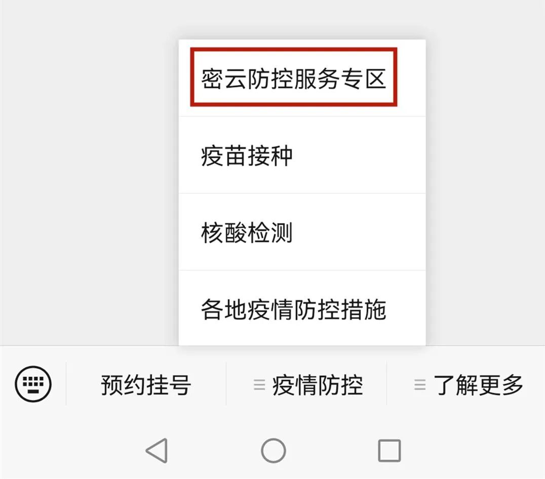 在“健康密云”微信公众号“疫情防控”菜单,选择“密云防控服务专区”。