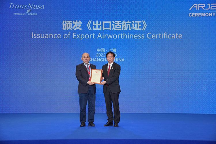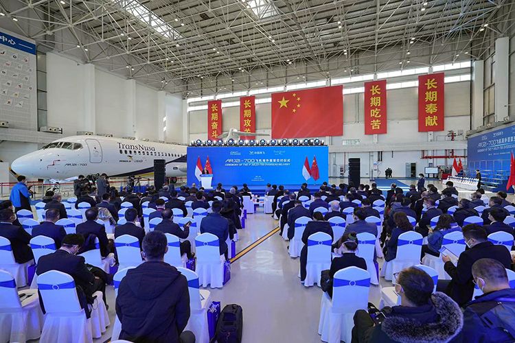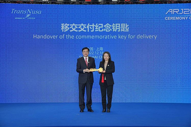 12月18日,我国自行研制具有完全自主知识产权的喷气式支线客机ARJ21正式交付首家海外客户印尼翎亚航空(TransNusa)。这是中国的喷气式客机首次进入海外市场,对于建设“一带一路”,构建“双循环”新发展格局具有重要意义。图为:交付仪式现场,向客户移交交付纪念钥匙。