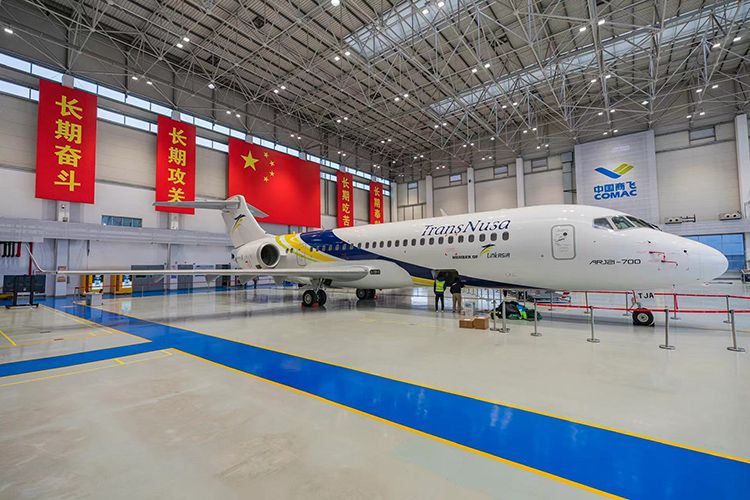 此次交付翎亚航空的ARJ21飞机机身印有印尼国旗图案,外部涂装以翎亚航空LOGO的色调为基础进行了设计。