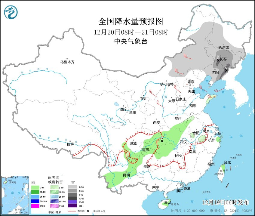 12月20日8时至21日8时,内蒙古中东部、东北地区中南部有小到中雪,其中辽宁东部、吉林中部和东南部局地有大雪(5~9毫米),安徽北部和南部、山东半岛东部等地部分地区有雨夹雪,云南中部和东北部、四川南部、重庆、湖南北部、湖北中西部、河南南部、浙江东北部、海南岛中东部等地部分地区有小雨。
