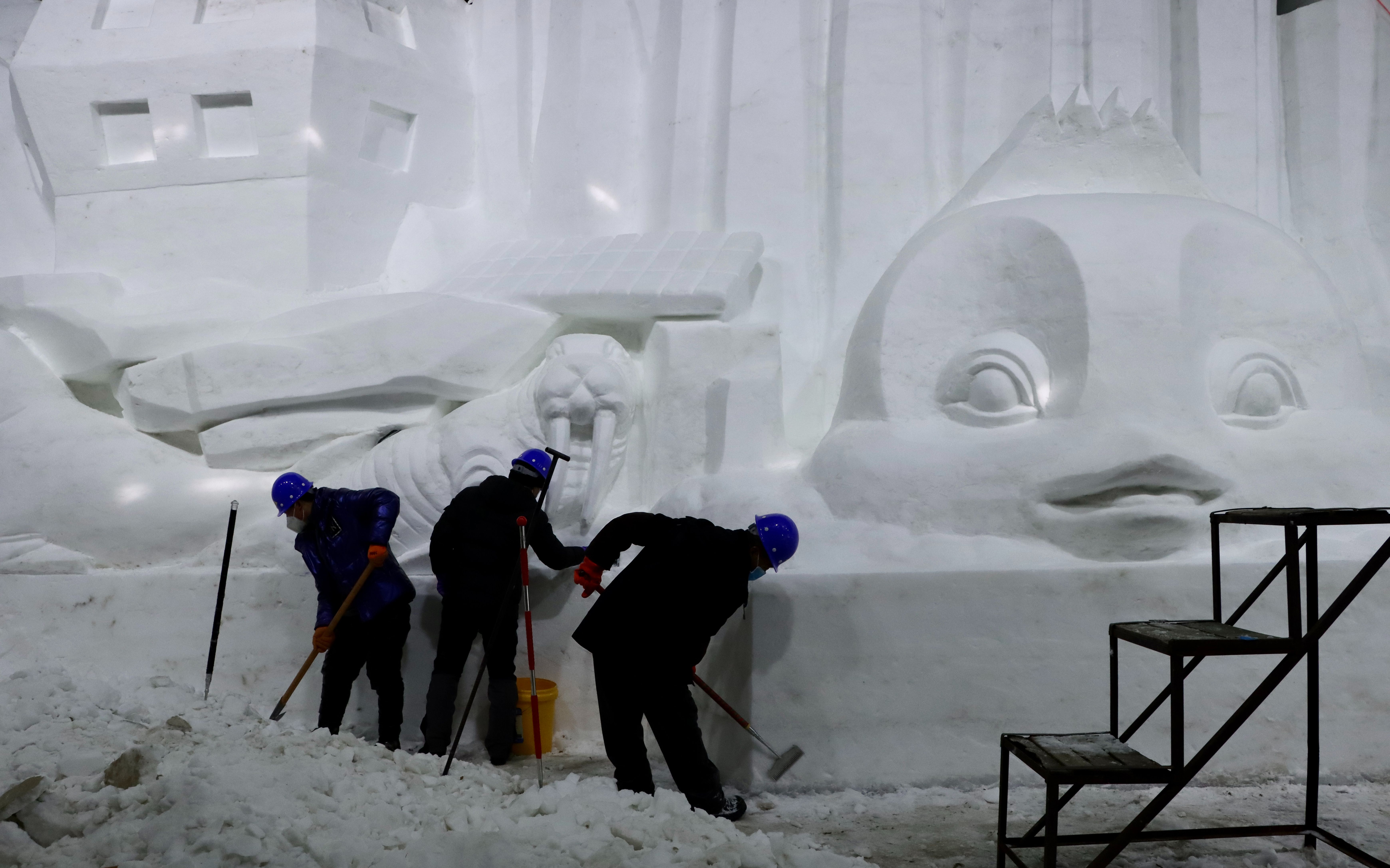 冰灯嘉年华正在进行造型布景。韩洁 摄
