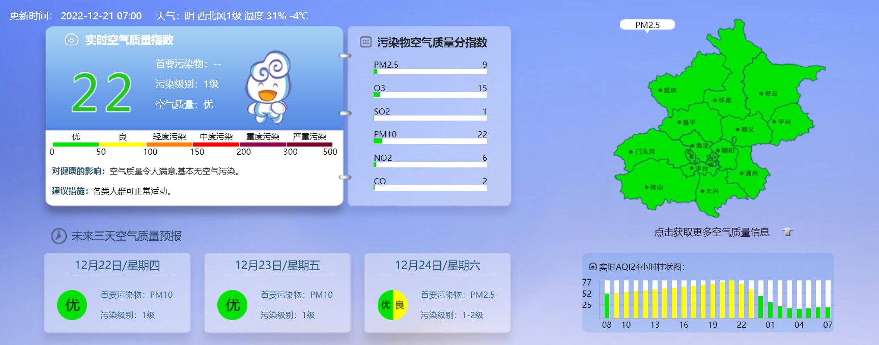 据北京市生态环境监测中心今早7时数据,目前实时空气质量指22,空气质量优。