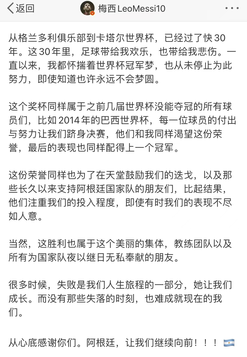 梅西发长文:这个奖杯同样属于之前几届世界杯没能夺冠的所有球员
