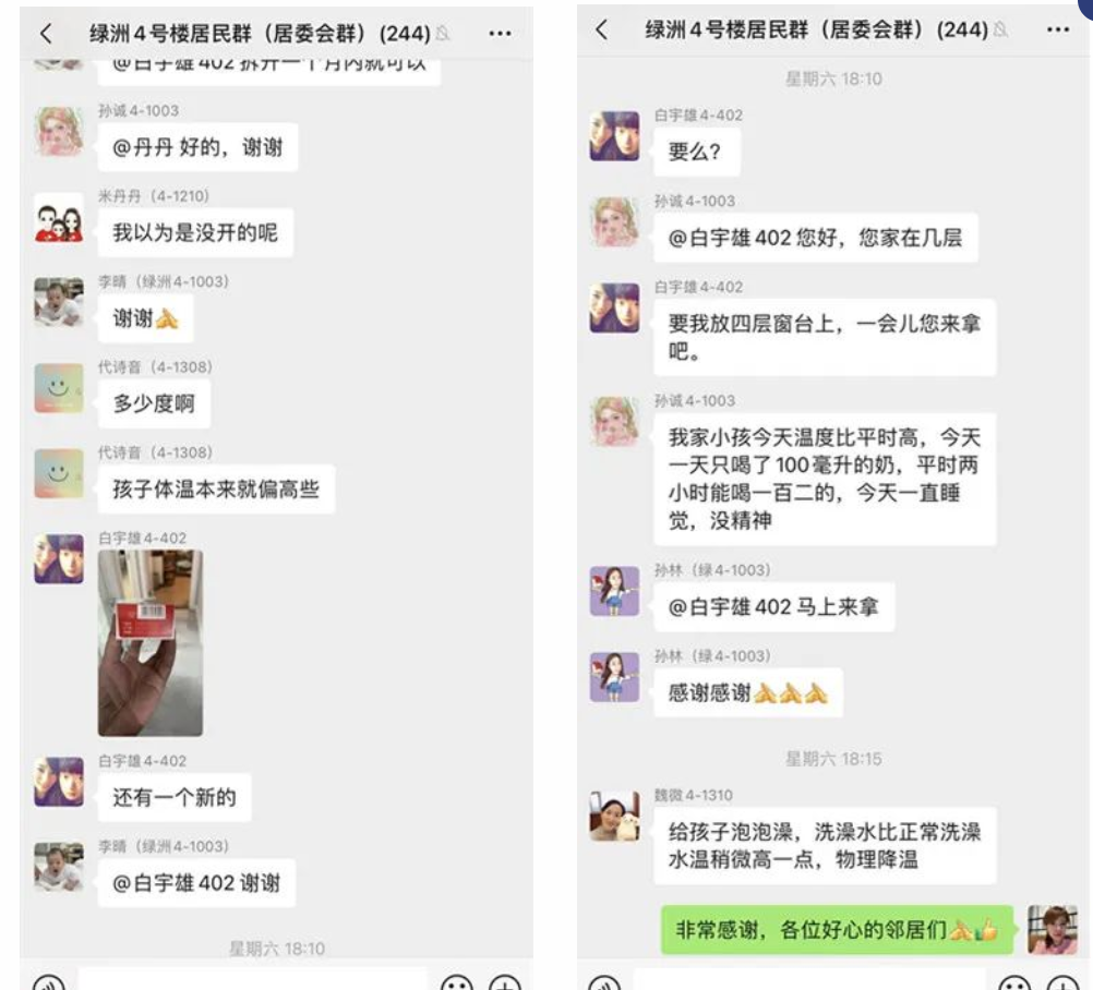 “我家有美林”“孩子太小不能喝,先物理降温”“我家有退热贴,你试试”“我家有半瓶泰诺林,就是临近保质期,要不您先用?”有的居民提供链接,帮忙联系儿科医生;有的居民提供购药热线,有的提供降温经验……大家纷纷在微信群里发言,提供力所能及的帮助。在热心邻居的帮助下,家长顺利拿到了药。