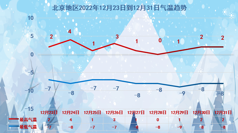 在气温方面,2022年的最后几天,北京的最高气温在0℃~4℃之间,总体保持在零度以上。夜间最低气温比较平稳,在-7℃~-9℃之间。气象专家提醒,早晚气温较低,大家要继续做好防寒保暖工作;另外,23日、27日都有较强的北风,请大家关注临近预报,注意防范。