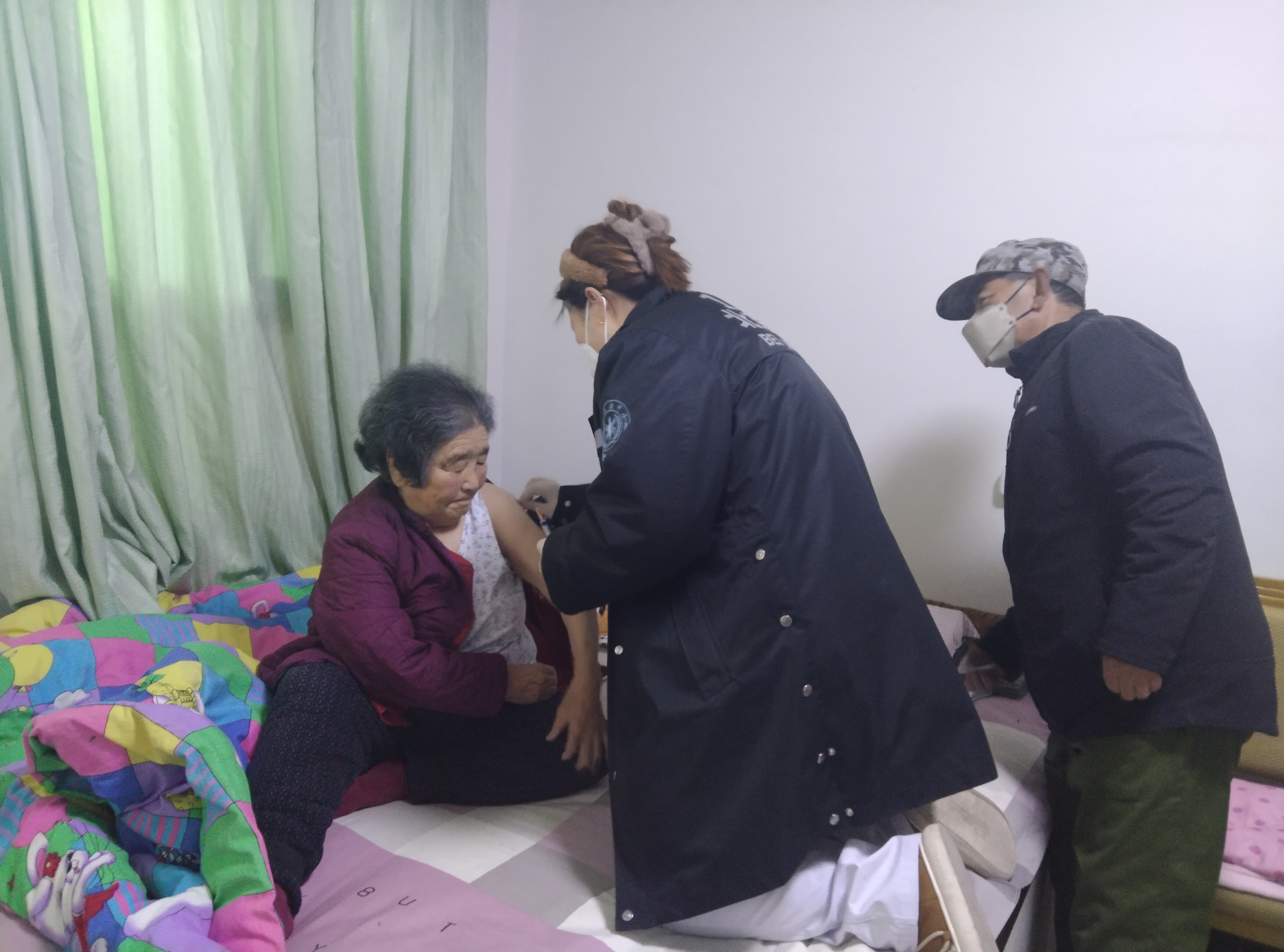 碾子村84岁的唐玉莲由于常年瘫痪在床,难以出门完成疫苗接种工作,家人便向所居住的碾子村村委会求助。在地区与村委会的积极安排下,宝山镇社区卫生服务中心选派诊疗和接种经验丰富的医务人员,携带相关设备和药品为老人提供“进家门”的接种服务,顺利地完成了第三针接种。松树台村96岁的老党员吴永春在家属的协助下来到村委会,完成了第三针疫苗接种。打完针的他告诉工作人员“这下心里踏实多了”。