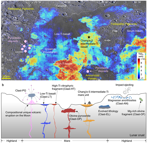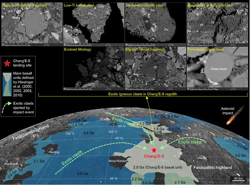 中国科学院地球化学研究所科研团队通过分析超过3000颗嫦娥五号月壤颗粒,识别出7颗不同于嫦娥五号中钛玄武岩的火成岩碎屑,包括:高钛玻基斑状岩石碎屑、低钛玄武岩碎屑,橄榄辉石岩碎屑、镁质斜长岩碎屑、高度演化岩石碎屑、富镁橄榄石碎屑和火山玻璃碎屑。