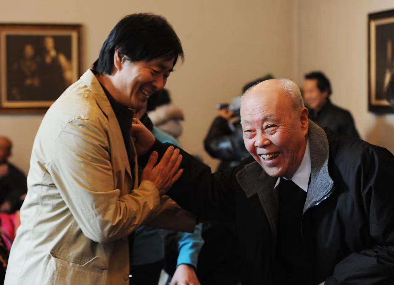 2010年3月10日,北京,《茶馆》第二代演员濮存昕在话剧《茶馆》演出600场庆祝酒会上问候郑榕。自1958年3月29日北京人艺首演《茶馆》,2010年3月10日迎来了第600场演出。参加1958年首演的蓝天野、郑榕等人齐来分享这一喜悦。《茶馆》第二代演员濮存昕、杨立新等人向老前辈们问候健康。