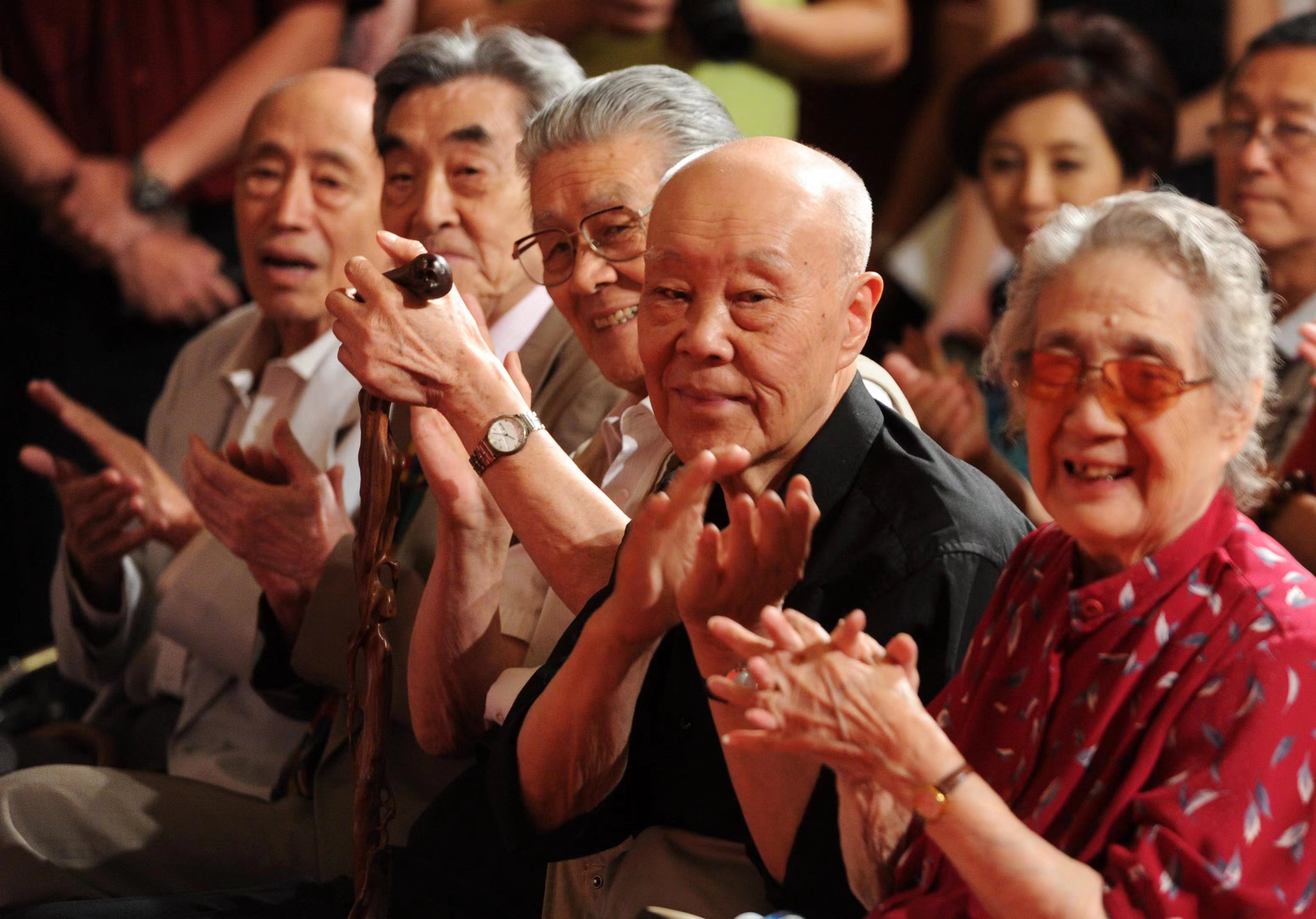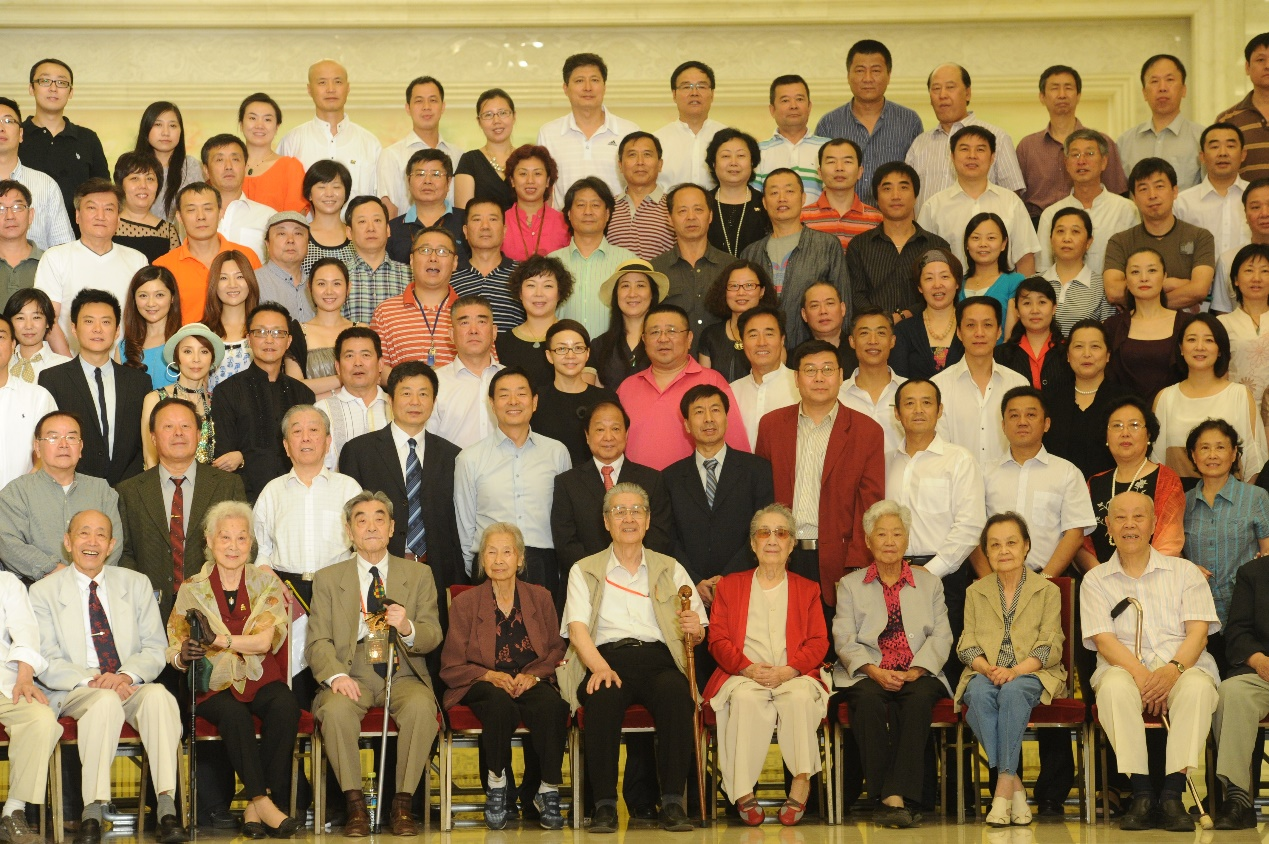 2012年6月12日,北京,郑榕(前排右1)和参加北京人民艺术剧院建院60周年庆祝活动的艺术家们一起合影留念。