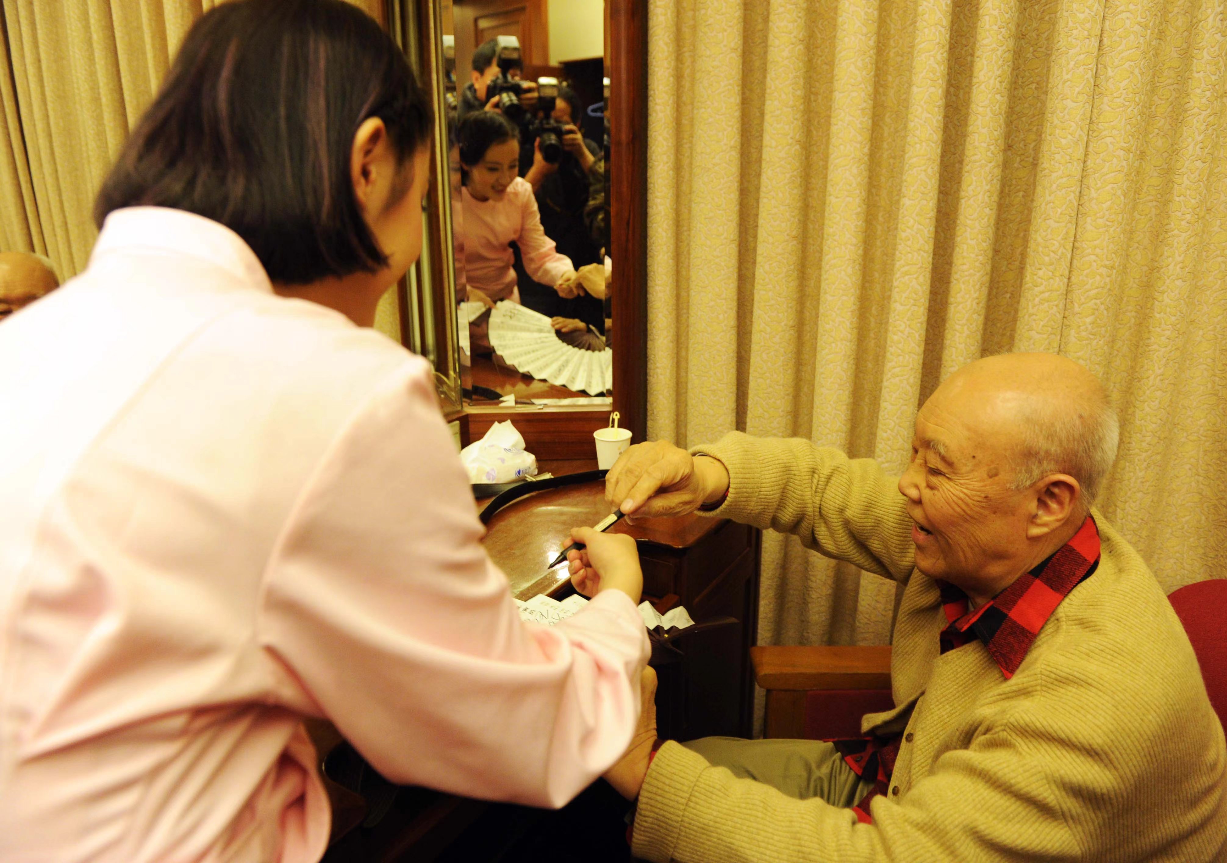 2012年10月20日,北京,郑榕在剧院后台化妆间给粉丝签名。