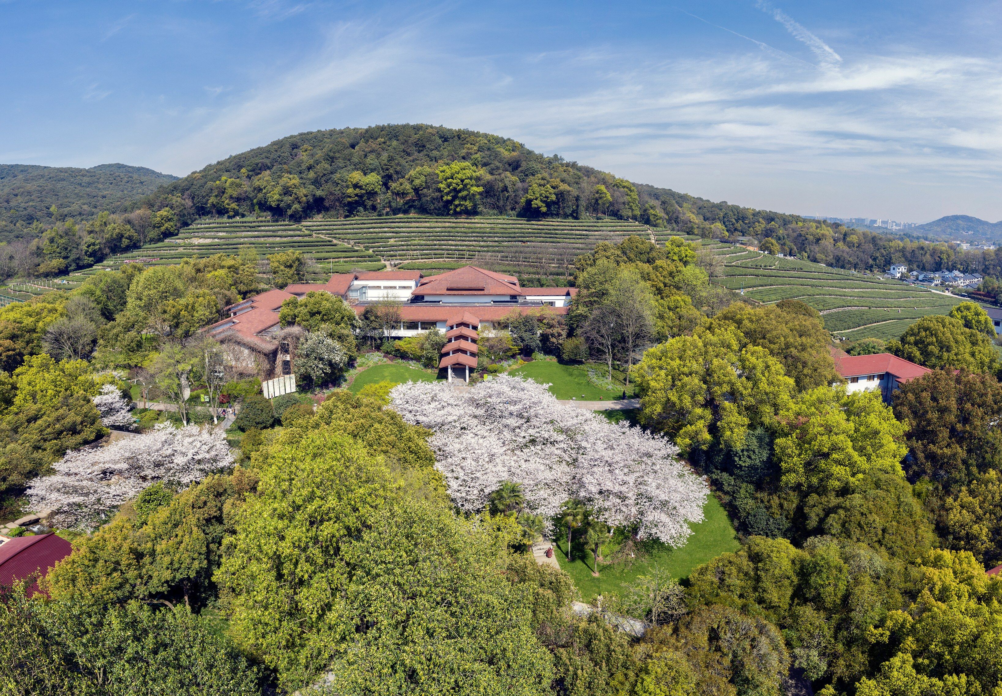 中国茶叶博物馆龙井馆区,坐落在翁家山茶山东麓,森林覆盖率高达70%,是具有山地园林景观特色的茶主题互动体验博物馆。游人登上龙井馆区最高处,可以在茶坛上远眺四周茶山。