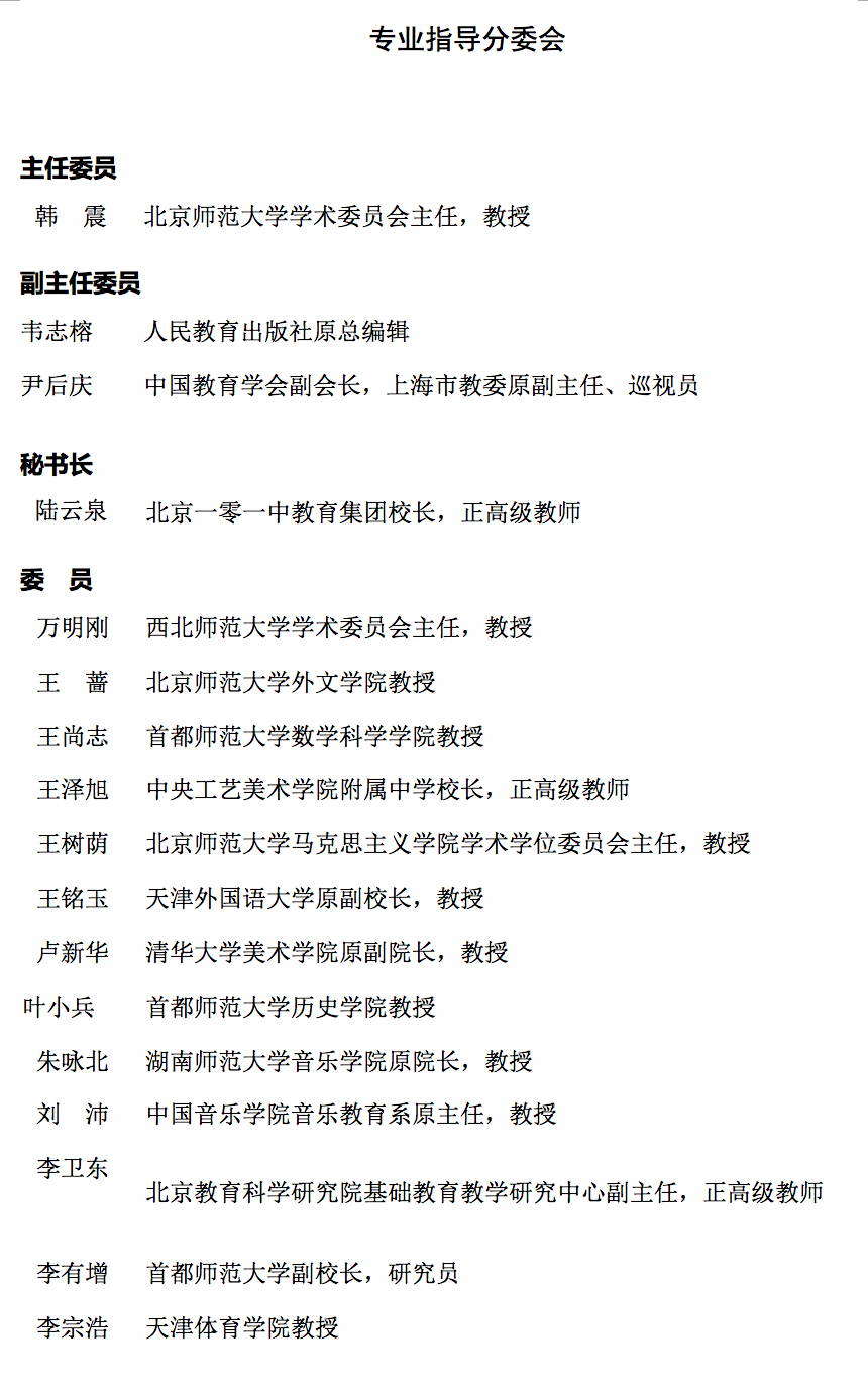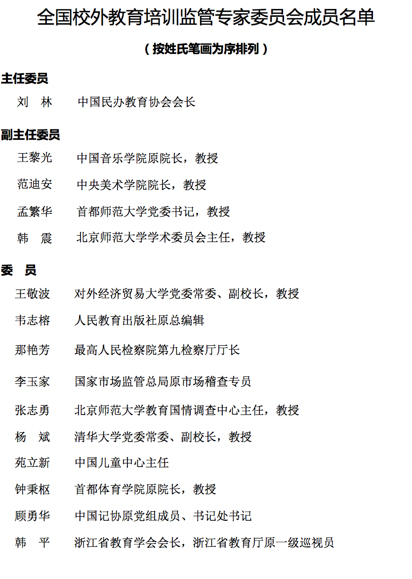 名单显示,全国校外教育培训监管专家委员会设一位主任委员,由中国民办教育协会会长刘林担任,副主任委员4名,分别为中国音乐学院原院长、教授王黎光,中央美术学院院长、教授范迪安,首都师范大学党委书记、教授孟繁华,北京师范大学学术委员会主任、教授韩震。同时,还设有10名委员。