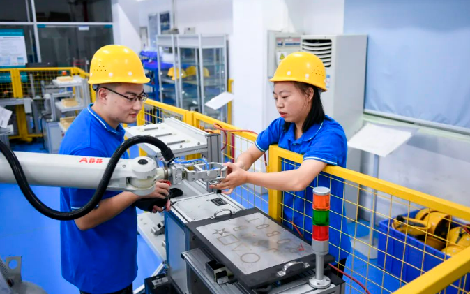 ▲深圳职业技术学院,在ABB机器人实训室,学生们一起练习运行工业机器人。图/新华社