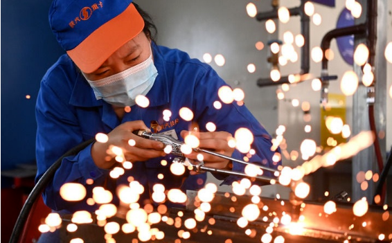 ▲2022年4月26日,“全国技术能手”胡敏在进行火焰切割。图/新华社