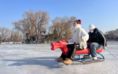 记者今天在南门荷花湖看到,湖面冰层冻得厚实,冰场刚一开门,不少游客已经迫不及待入场,在冰面上玩起了冰车。