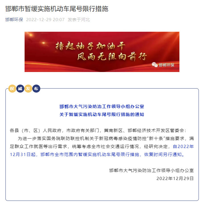 新京报讯 据邯郸环保官微消息,为进一步落实国务院联防联控机制关于新冠病毒感染疫情防控“新十条”措施要求,满足群众工作就医等出行需求,统筹考虑全市社会交通运行情况,经研究决定,自2022年12月31日起,邯郸市全市范围内暂缓实施机动车尾号限行措施,恢复时间另行通知。