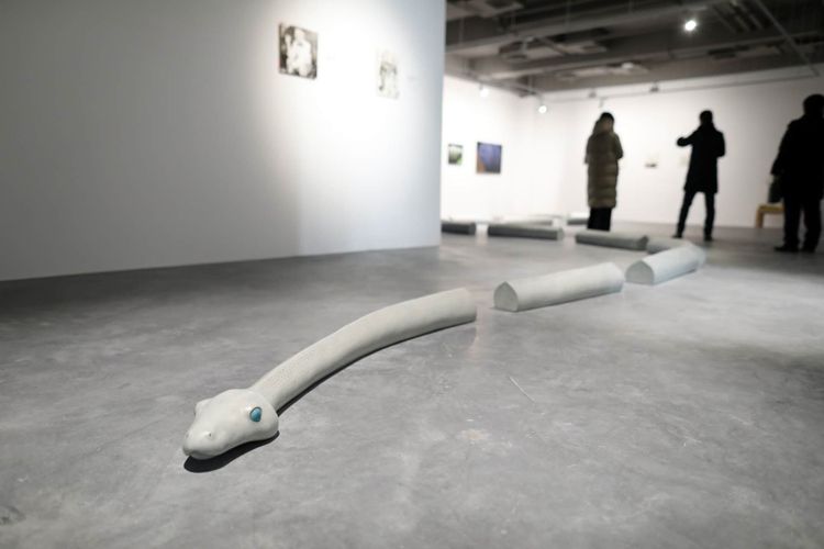 12月30日,2022首届北京艺术双年展在国家对外文化贸易基地(北京)正式开幕。2022首届北京艺术双年展以“共生”为主题,呈现了来自20个国家和地区的240位艺术家的390多件作品。展览将持续至2023年3月12日。图为艺术家向京的玻璃钢着色作品《行形》。