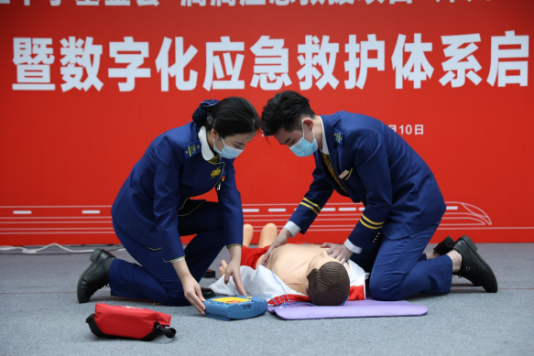 郑州地铁布设“应急救护一体机”,开展地铁工作人员应急救护培训演练。中国红十字基金会供图