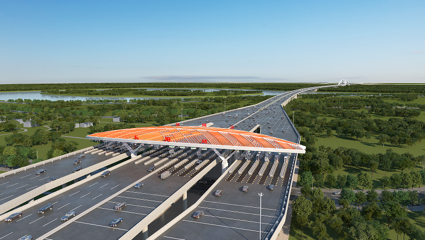 未来开通的主线收费站——长阳北收费站,也是工程另一大亮点。长阳北收费站是国内第一座陆地高架桥主线收费站,跨过房山区兰花文化公园。为了避免对公园造成隔离,桥下空间进行光影分析,整齐布设桥墩;桥梁中心设置透光隔离带,保证桥下采光,预留出广阔和舒适的桥下空间,拟进行体育、休闲设施设计,服务于居民休闲娱乐,实现沿线环境品质提升。