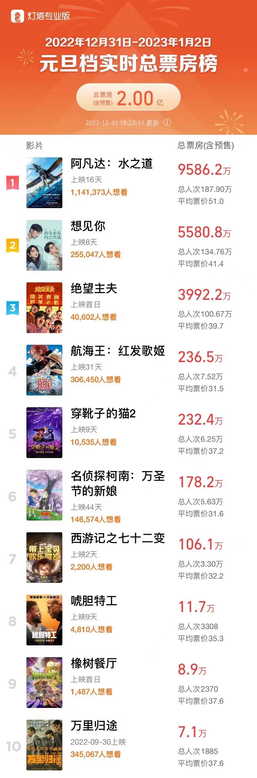 元旦档票房破2亿,《阿凡达:水之道》票房突破9亿