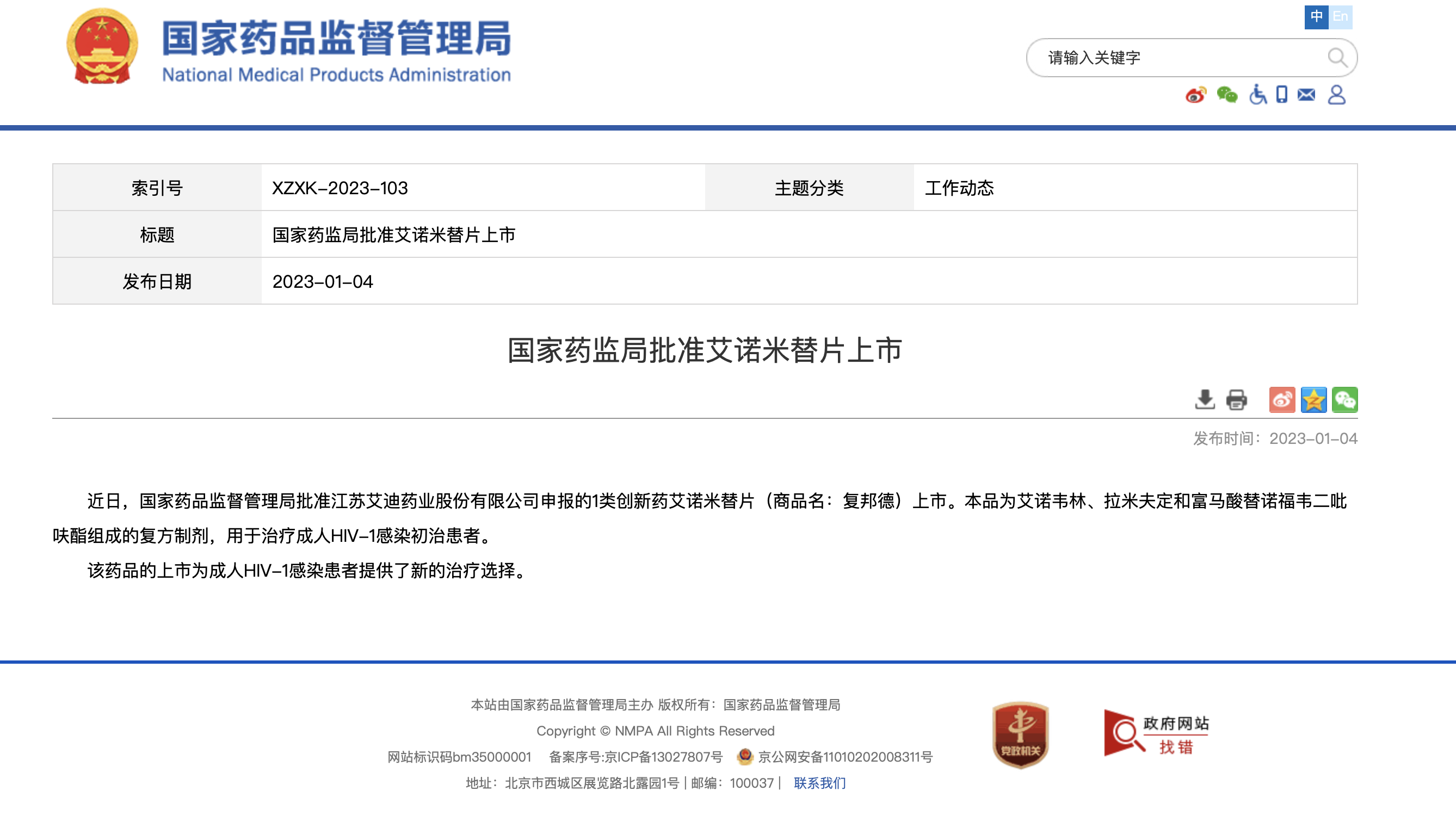艾诺米替片获批上市 可用于治疗成人HIV-1感染初治患者