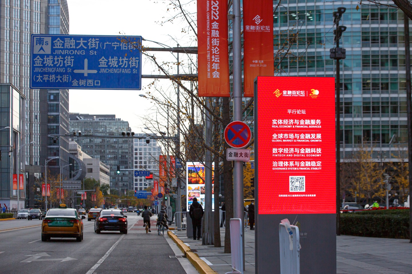 2022年11月21日,2022金融街论坛年会开幕,金融大街道路两旁挂满旗帜,论坛氛围浓厚。 新京报记者 郑新洽 摄