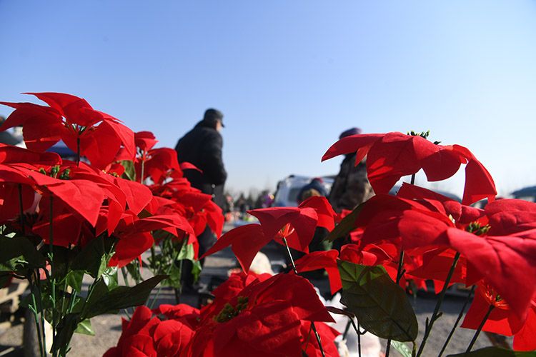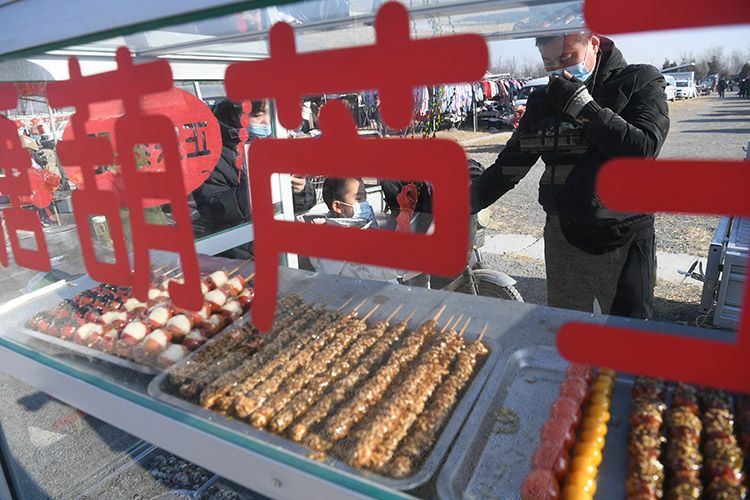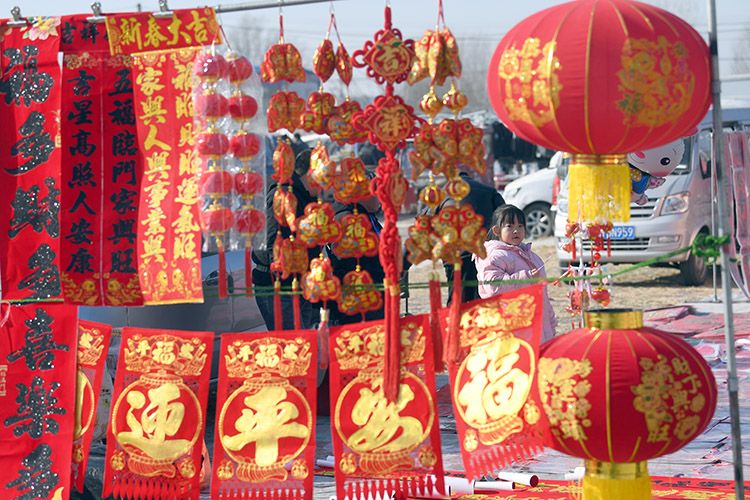 1月4日,农历腊月十三,随着春节临近,通州区永乐店大集吸引来不少采购年货的市民,大集上年味十足。图为:大集上红红火火的福字和灯笼。