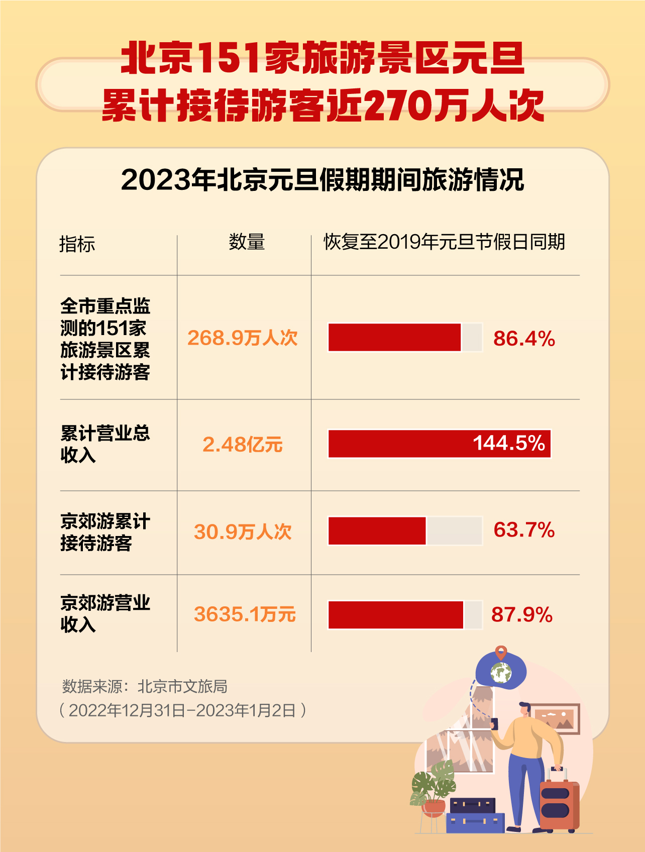 元旦出游,你买买买了吗?1月2日,北京市商务局发布的数据显示,2023年元旦假期,北京市商务局重点监测的百货、超市、专业专卖店、餐饮和电商等业态企业实现销售额35.3亿元,恢复至去年同期的83.8%。全市52个重点商圈客流量达1218.1万人次。 近一个月以来,多地发放文旅消费券提振当地旅游业,挖掘居民文旅消费潜力。