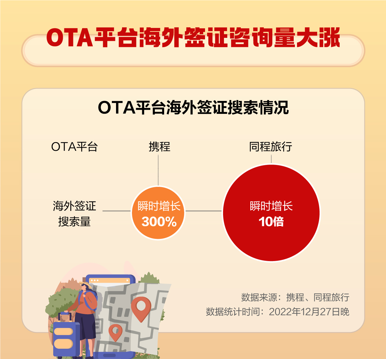 国家移民管理局于2022年12月27日晚宣布将有序恢复出国旅游等护照申请。出入境政策优化后,OTA平台海外签证咨询量大涨。携程海外签证的搜索量瞬时增长300%;同程旅行数据也显示,全平台签证搜索量瞬时增长10倍。