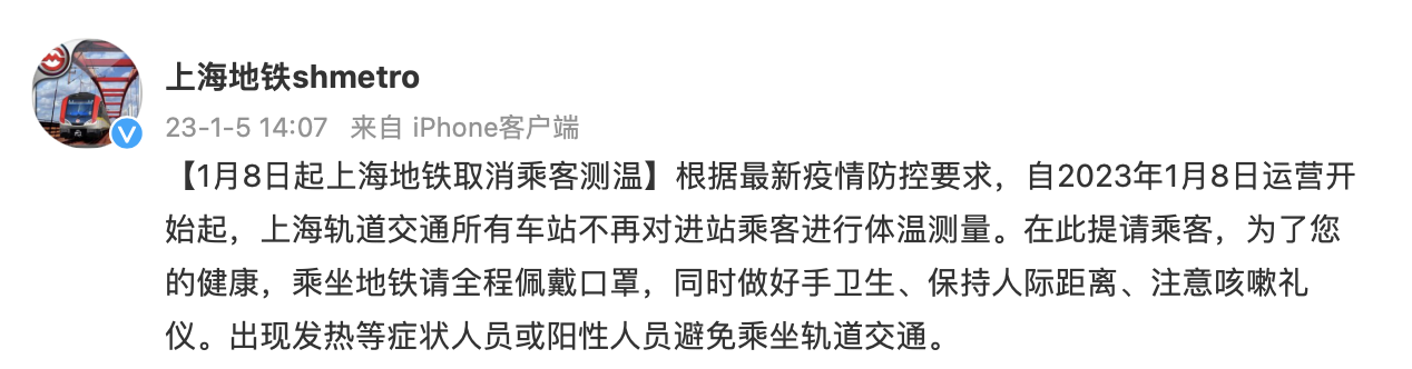 新京报讯 据上海地铁shmetro官博消息,根据最新疫情防控要求,自2023年1月8日运营开始起,上海轨道交通所有车站不再对进站乘客进行体温测量。在此提请乘客,为了您的健康,乘坐地铁请全程佩戴口罩,同时做好手卫生、保持人际距离、注意咳嗽礼仪。出现发热等症状人员或阳性人员避免乘坐轨道交通。