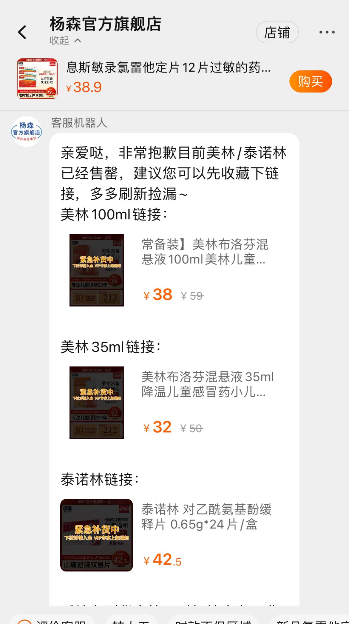 线下药店普遍缺货的美林布洛芬混悬液,互联网平台上的第三方商家有少量美林现货,泰诺林口服混悬液则普遍无货。京东平台,有第三方商家售卖儿童用的美林布洛芬混悬液30ml装,但需与12片装的布洛芬片搭售,价格在98元。1药网上,第三方商家售卖的儿童美林布洛芬混悬液100ml装,售价在138元。