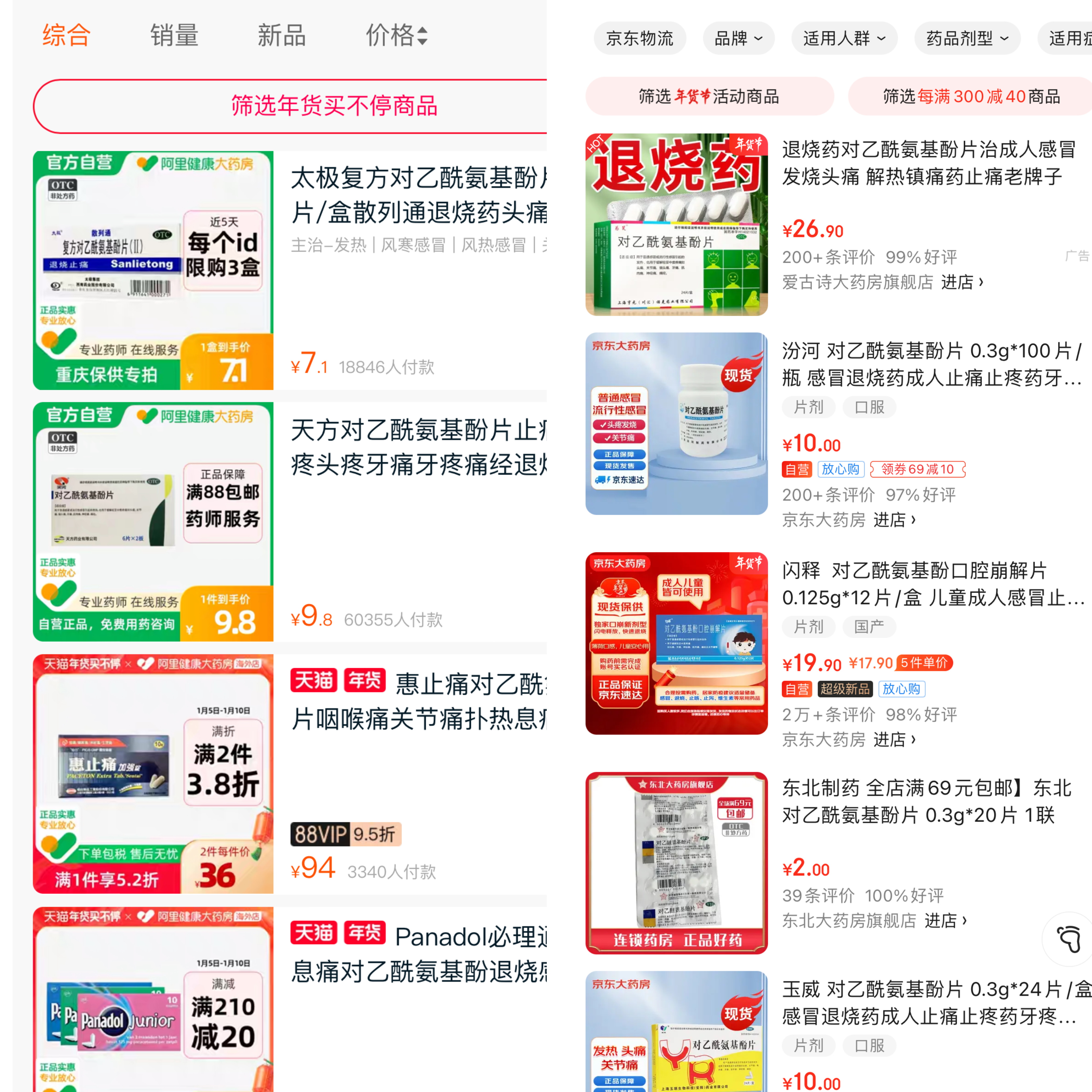 1月5日,记者在阿里健康、京东、1药网等平台上搜索布洛芬、对乙酰氨基酚,均有现货销售。比如,阿里健康上对乙酰氨基酚12粒售价9.8元,1药网上新华布洛芬片100粒/瓶售价29元,限购5件,京东平台上东北制药对乙酰氨基酚20片售价2元。