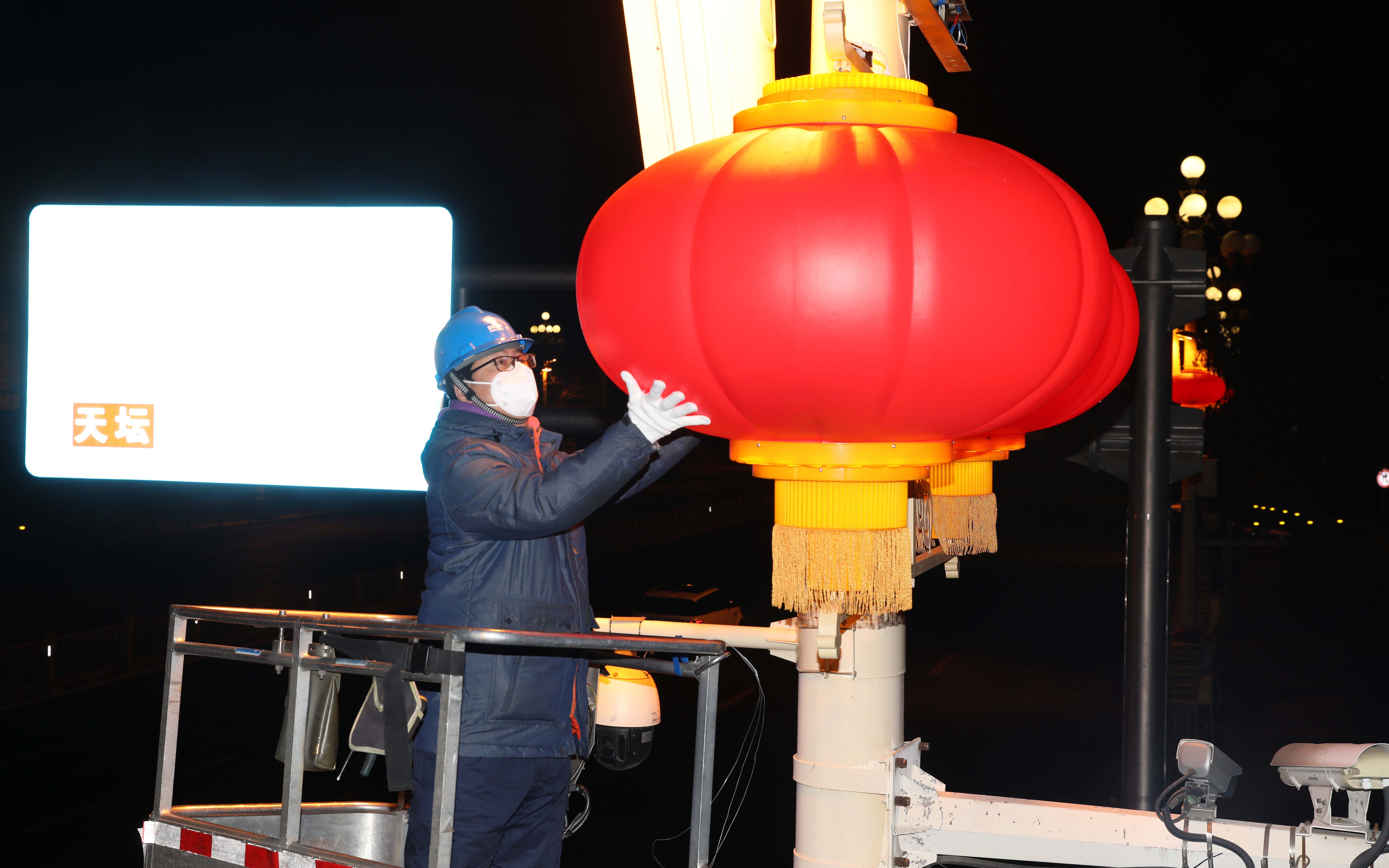 ▲2023年1月6日凌晨时分,北京长安街东单路口,工作人员在安装调试大红灯笼。新京报资料图