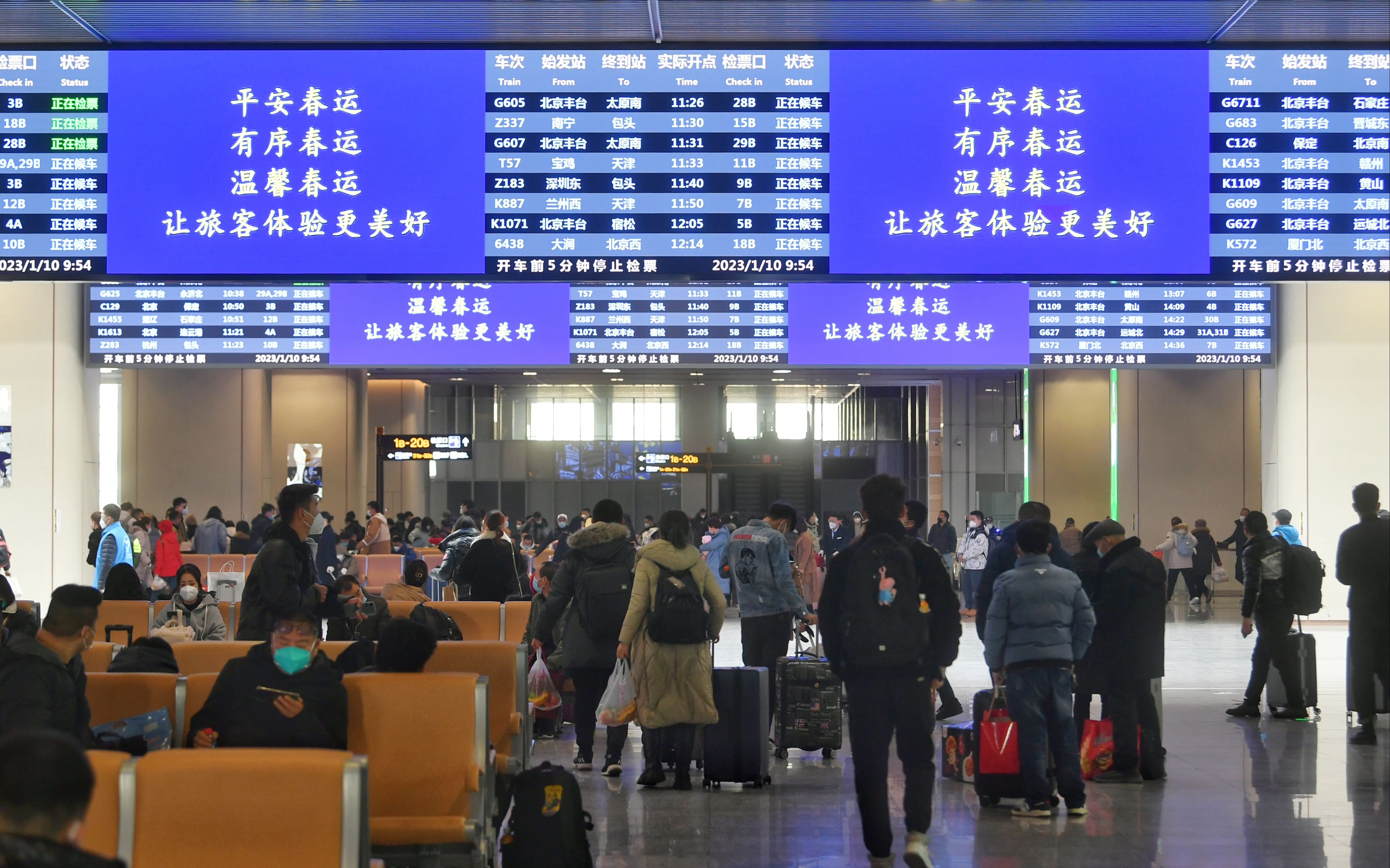 新京报讯(记者裴剑飞)今年是北京丰台站首次迎来春运,更是新冠感染调整为“乙类乙管”后的首个春运,许多两三年没能回家过年的游子踏上了归乡的旅途。随着假期临近,北京丰台站的客流量也在不断上涨。