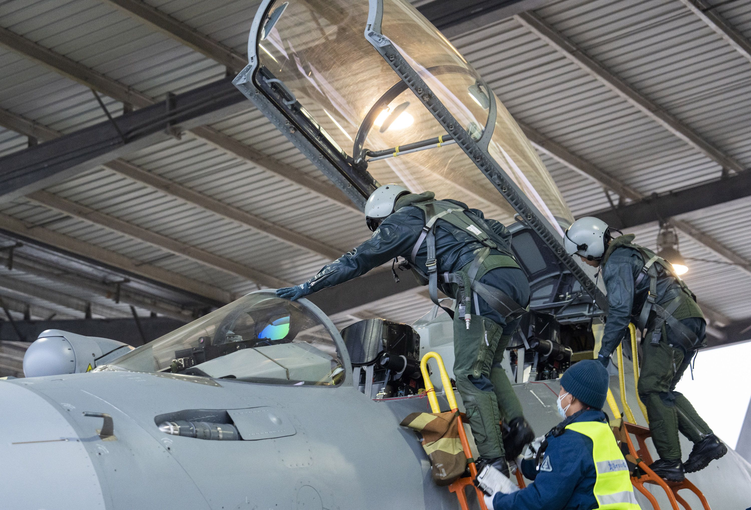 完成飞行训练任务后,飞行员走出飞机。