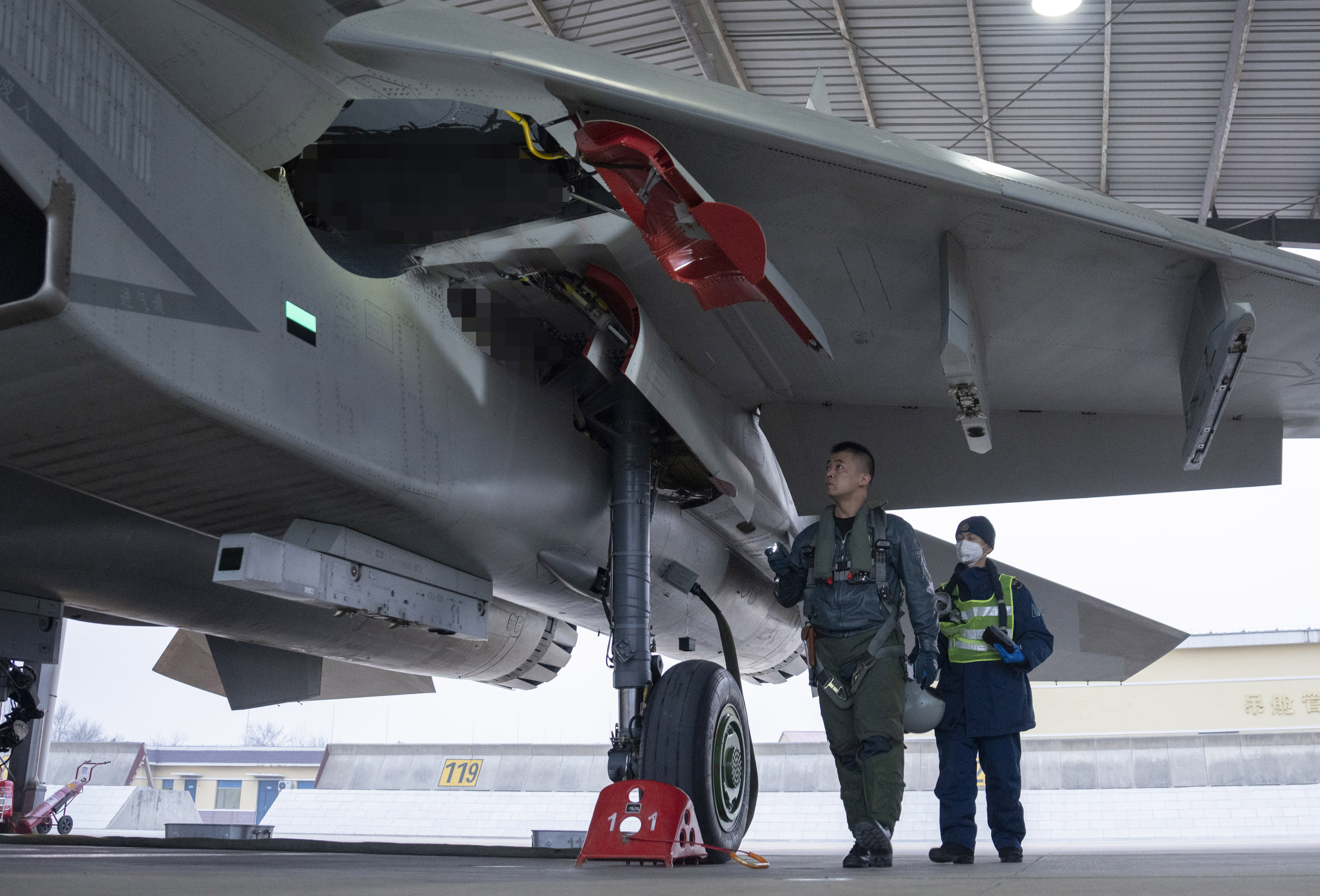战机完成夜航训练任务后,机务人员对飞机进行检查。