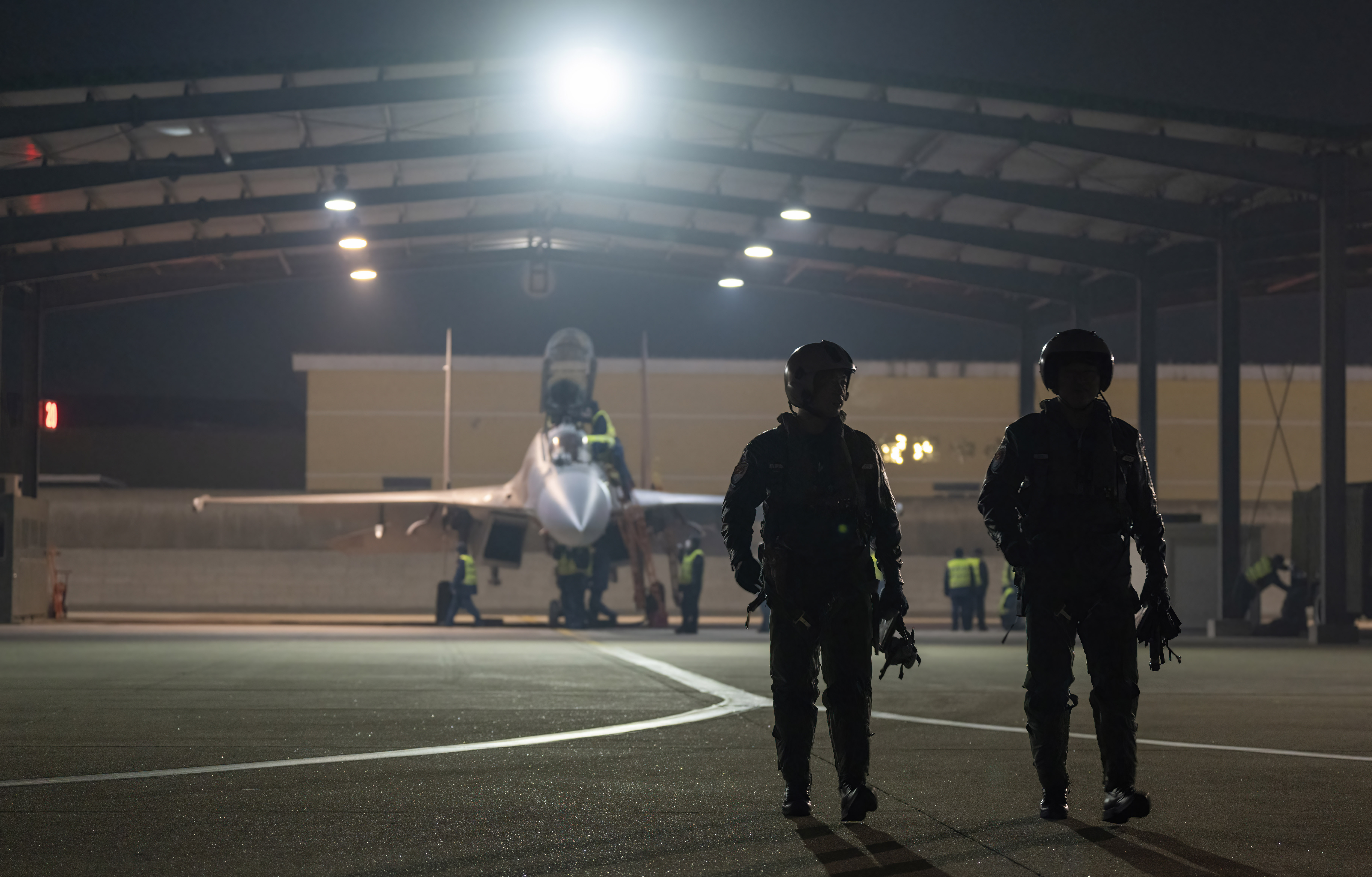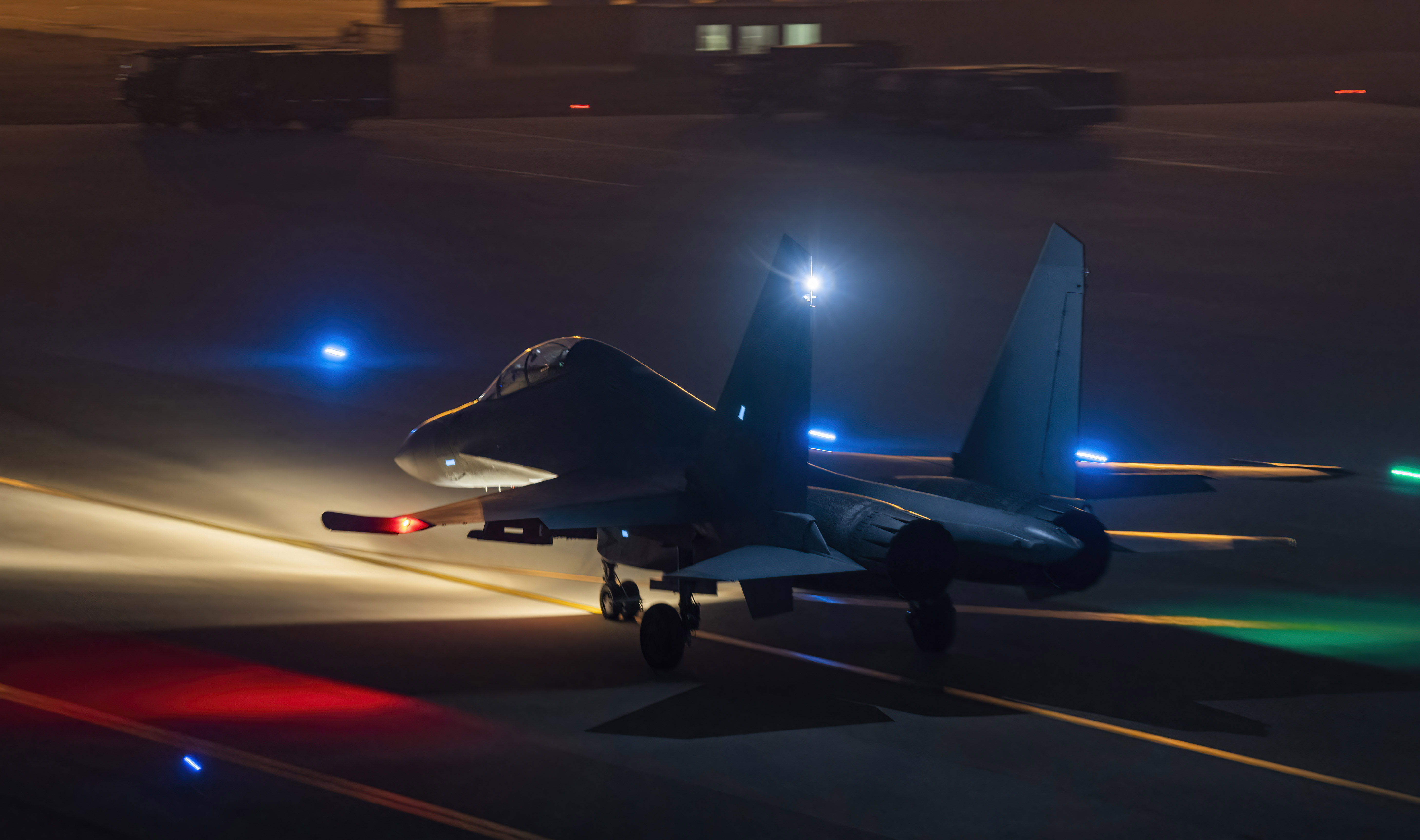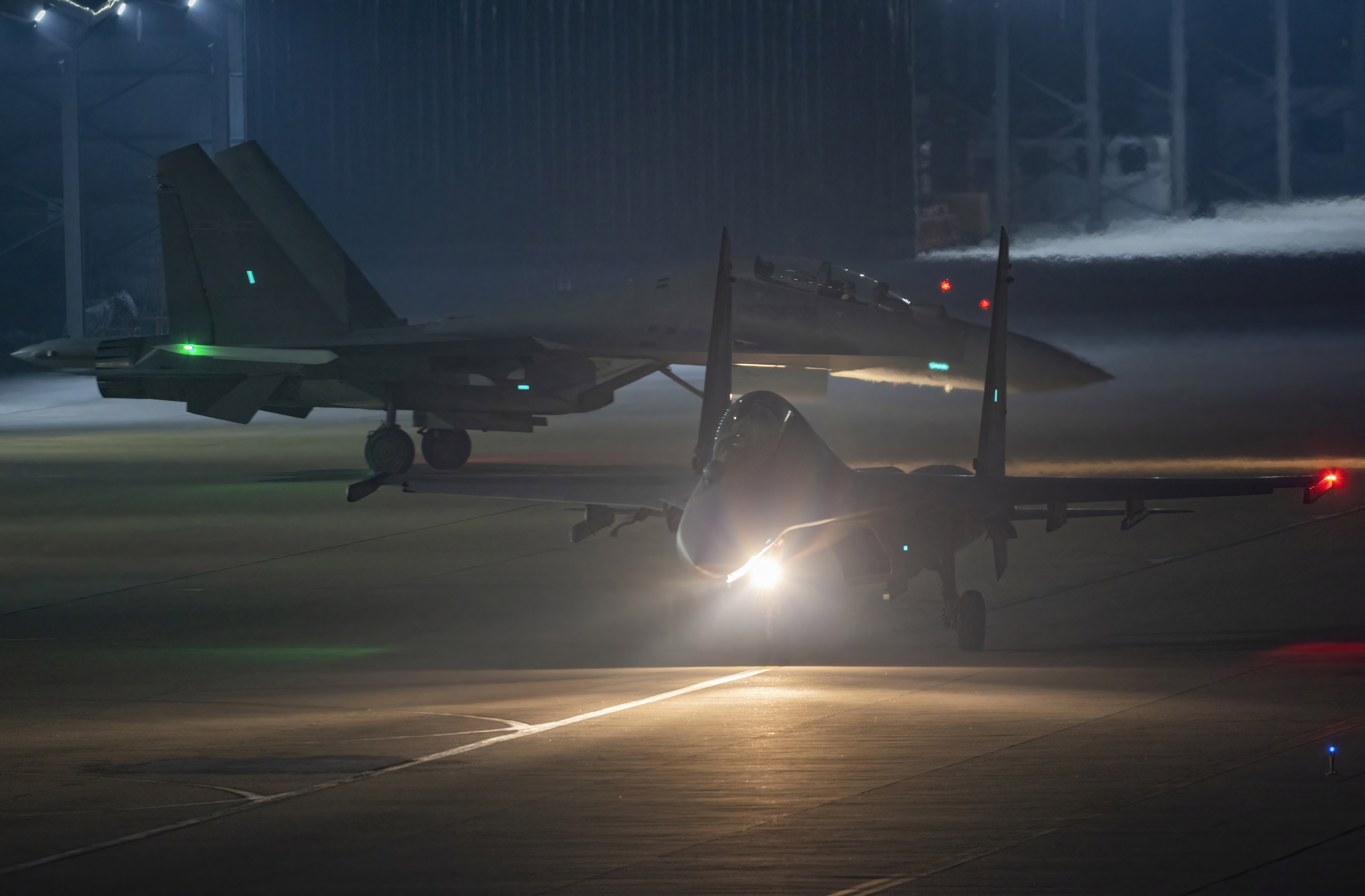 战机滑出机库准备进行夜航训练。