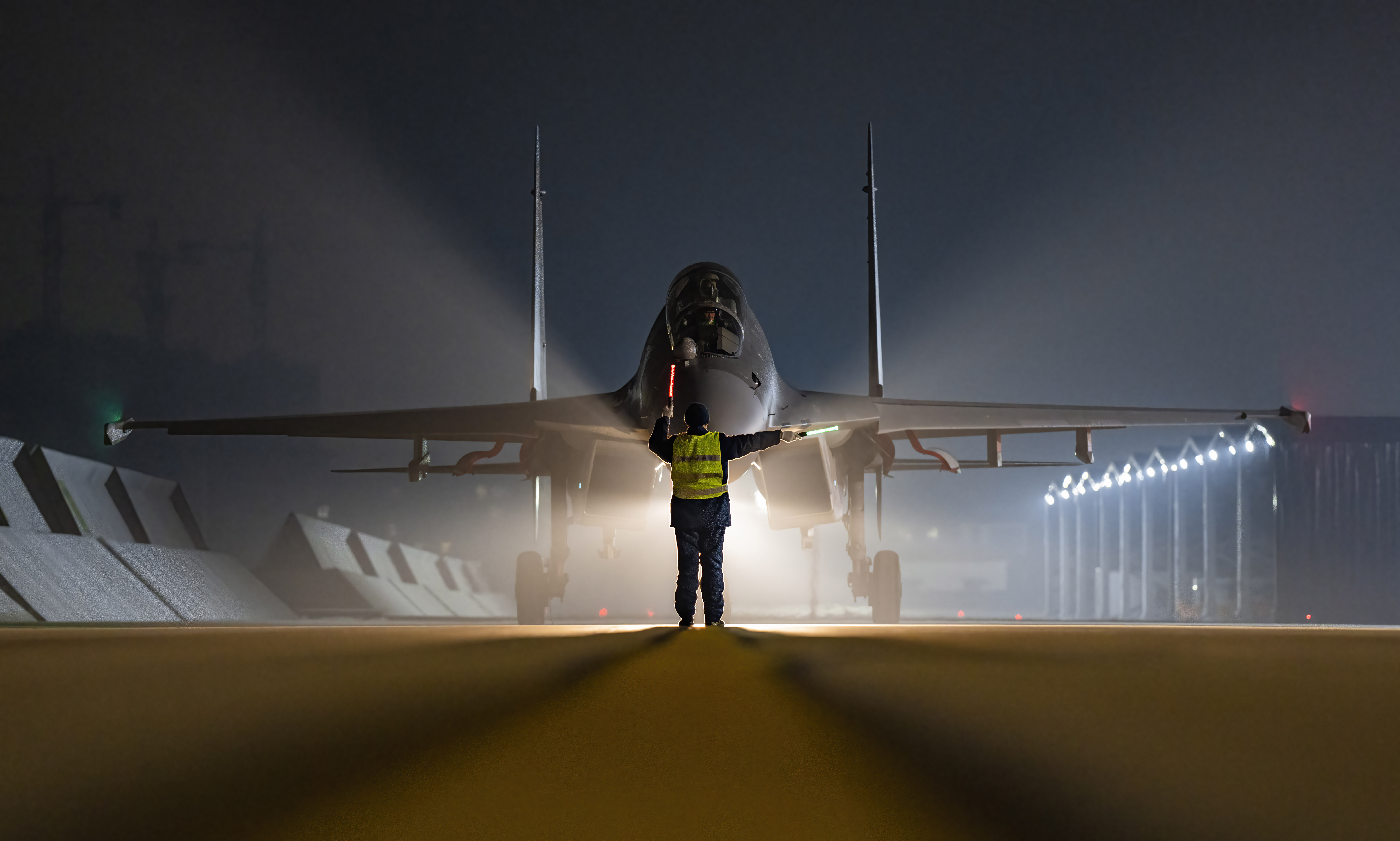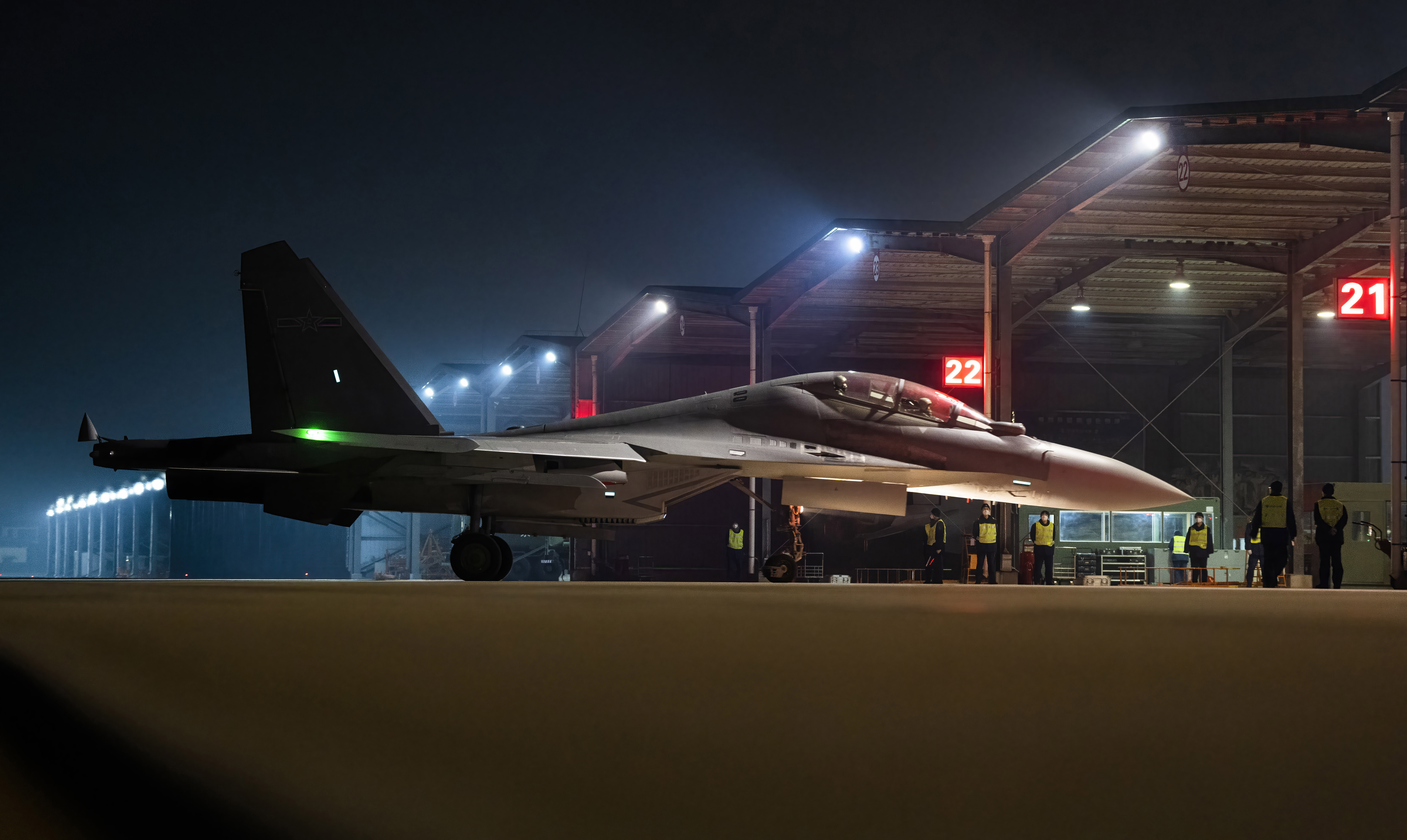 战机完成夜航任务后返回机场,在机务人员的引导下停入机位。