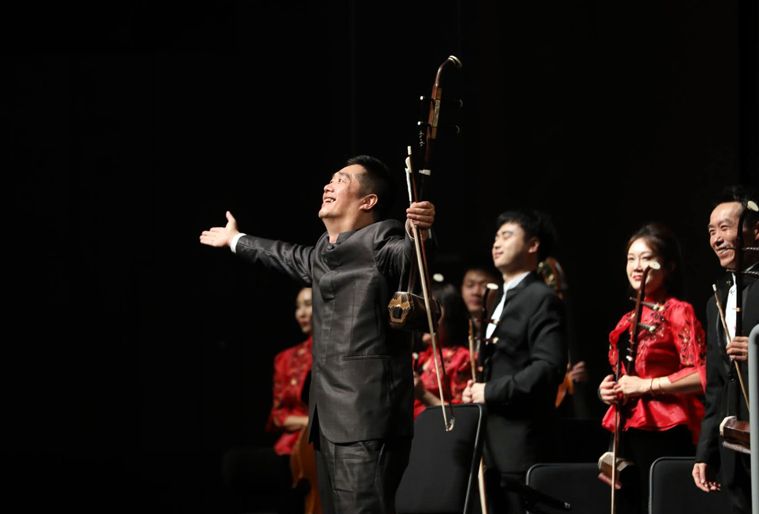 二胡演奏家唐峰和乐队演奏《长城随想》第三、四乐章后,向观众致谢。