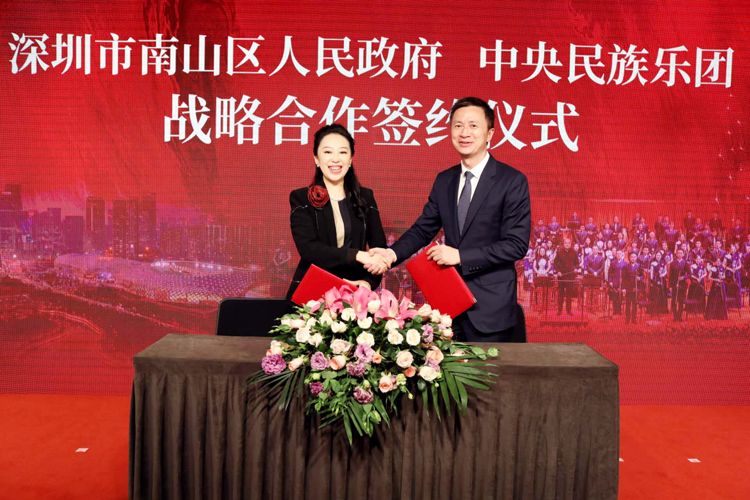1月12日晚,中央民族乐团和深圳南山区政府战略合作签约仪式在深圳保利剧院举行,根据框架协议,双方将携手在蛇口影剧院共建新国乐演出基地,举办民族音乐演出季及系列公益惠民活动,让深圳市民有更多机会聆听来自国家级乐团的天籁之音,传递中华历史之美、山河之美、文化之美,展现南山风采、深圳风华、中国风范 。