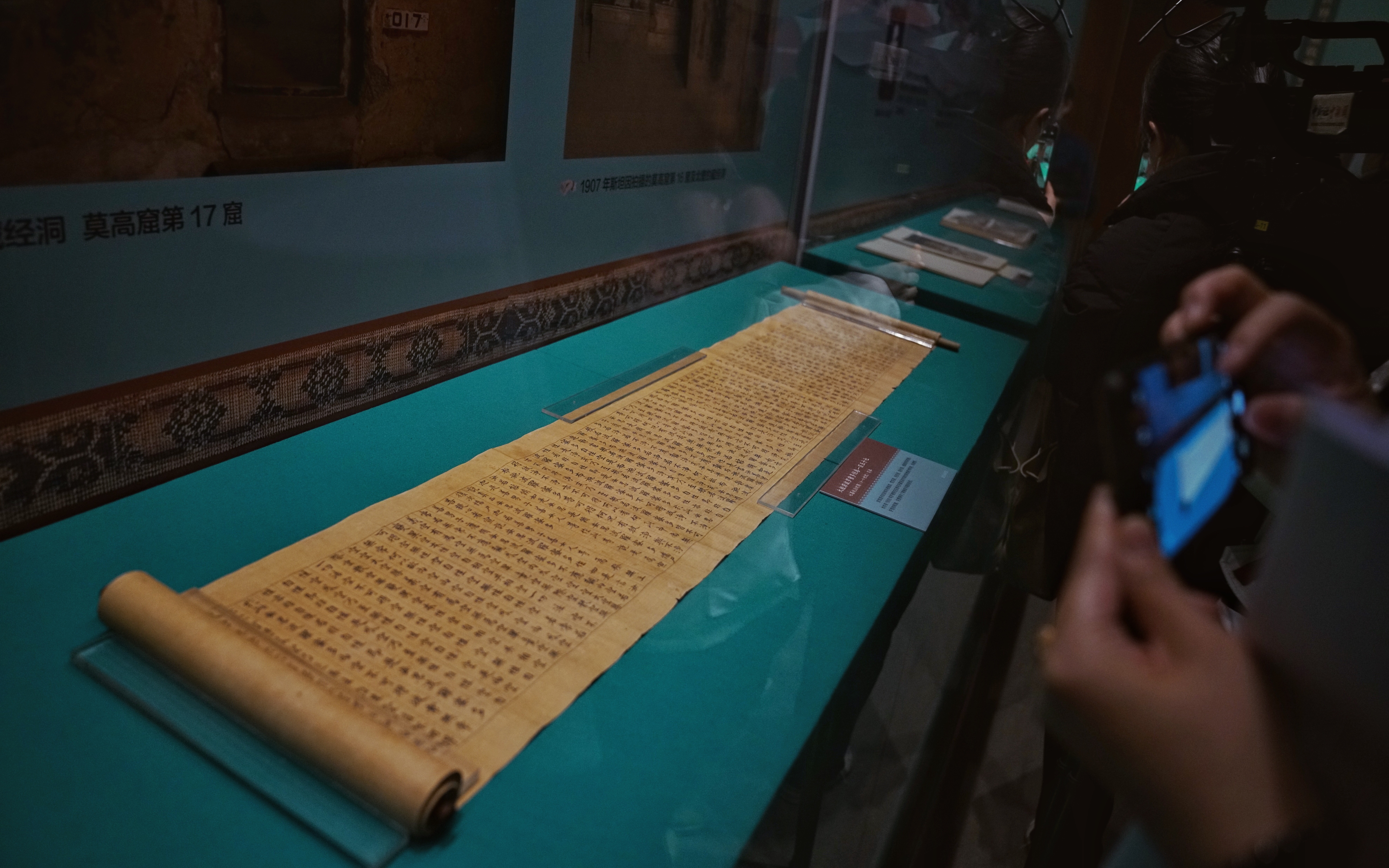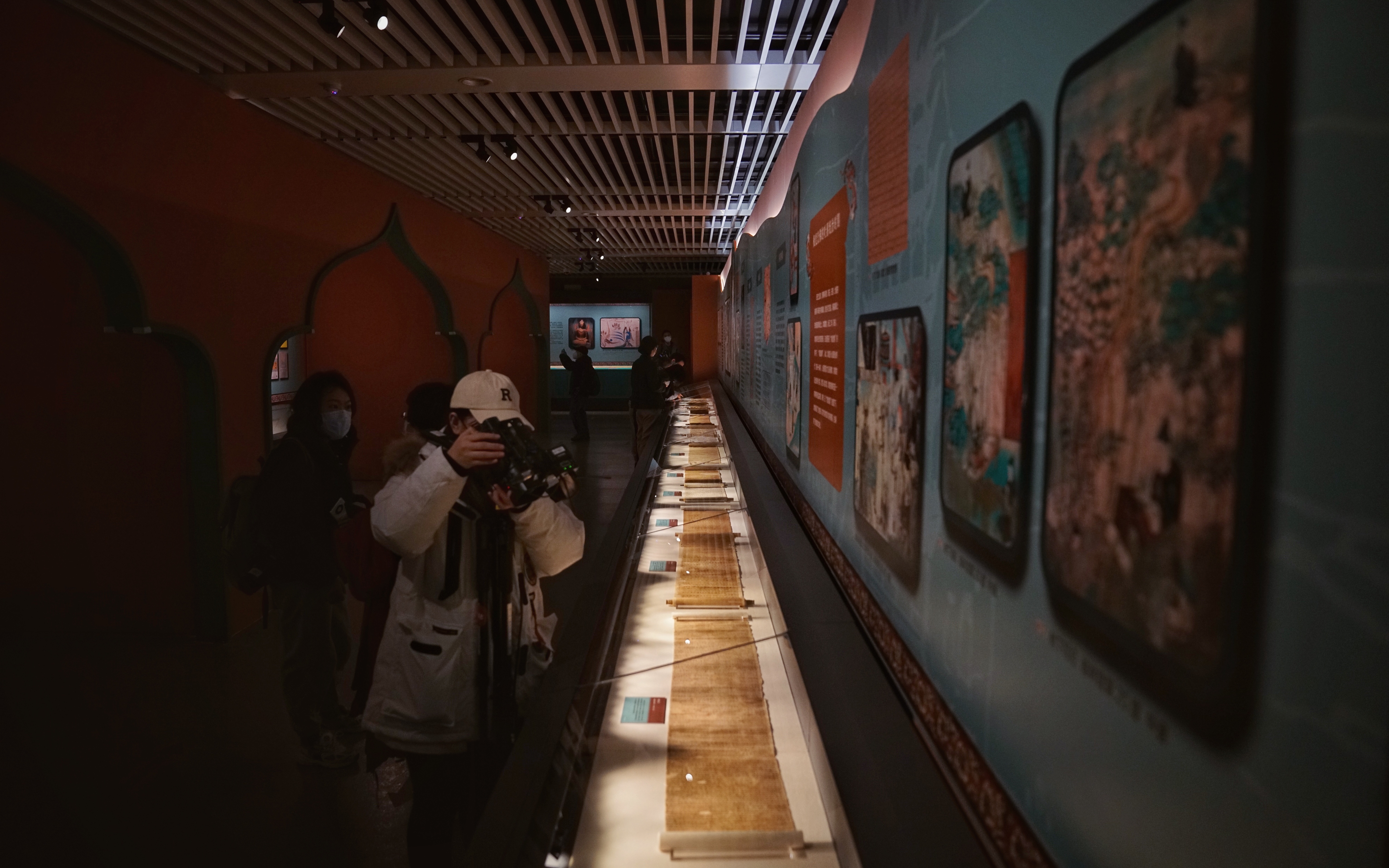 “敦煌遗书”展览选取了不同时期敦煌石窟的纹样、佛像等元素,并在展厅中大面积采用经典洞窟壁画,营造出璀璨瑰丽的敦煌特色,展示敦煌遗书中盛衰相继、融汇中西、异彩纷呈的中古世界。为全方位展现长卷,展览采用了大量长通柜,尽可能让观众看到展品全貌。