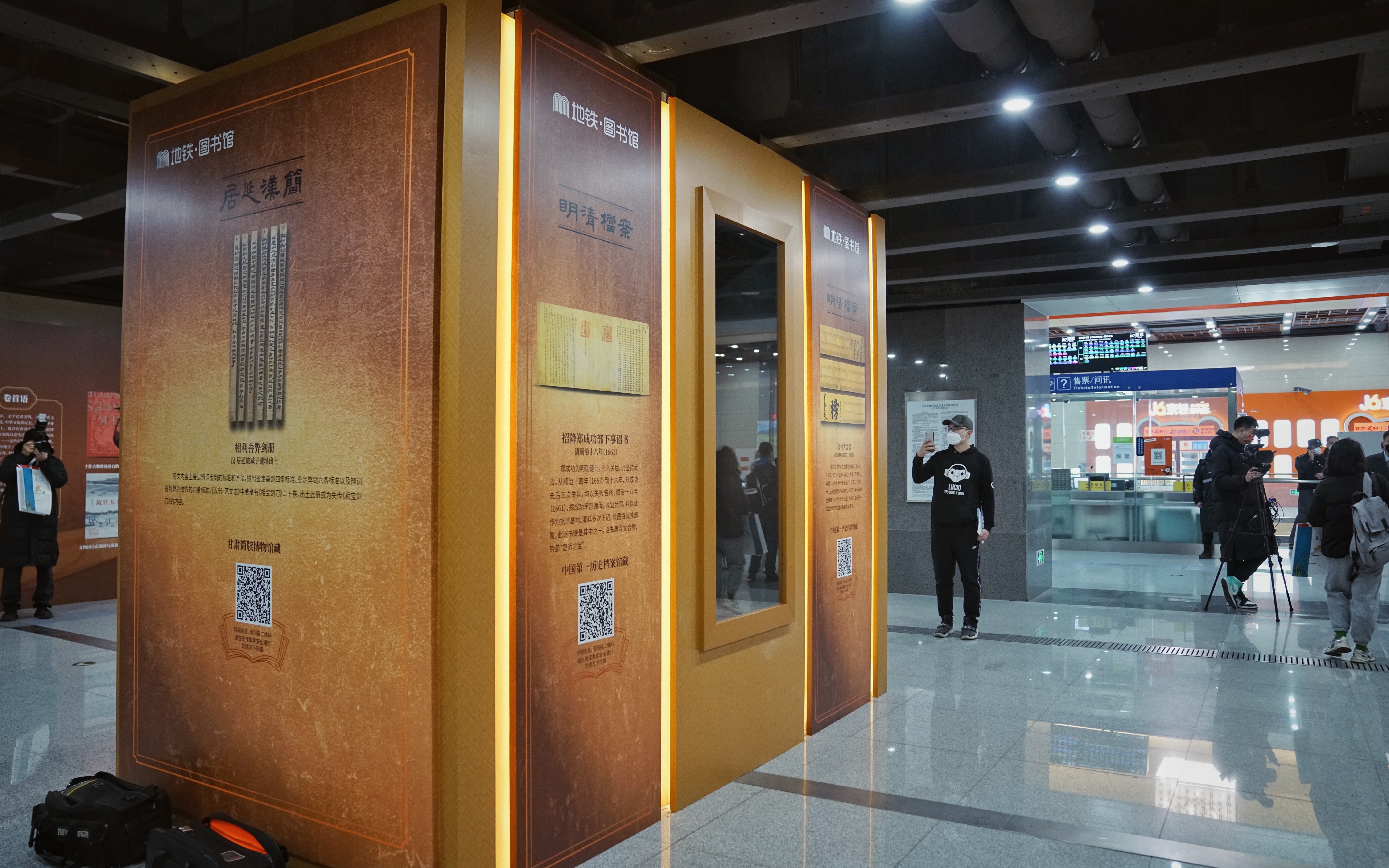 乘客从国家图书馆地铁站E口内进入展区,可以看到四个专题的文物仿制品11种。国家图书馆结合展览主题,与京港地铁联合主办的M地铁·图书馆推出地铁公益文化项目推出“探寻文明的印迹”活动。新京报记者 薛珺 摄