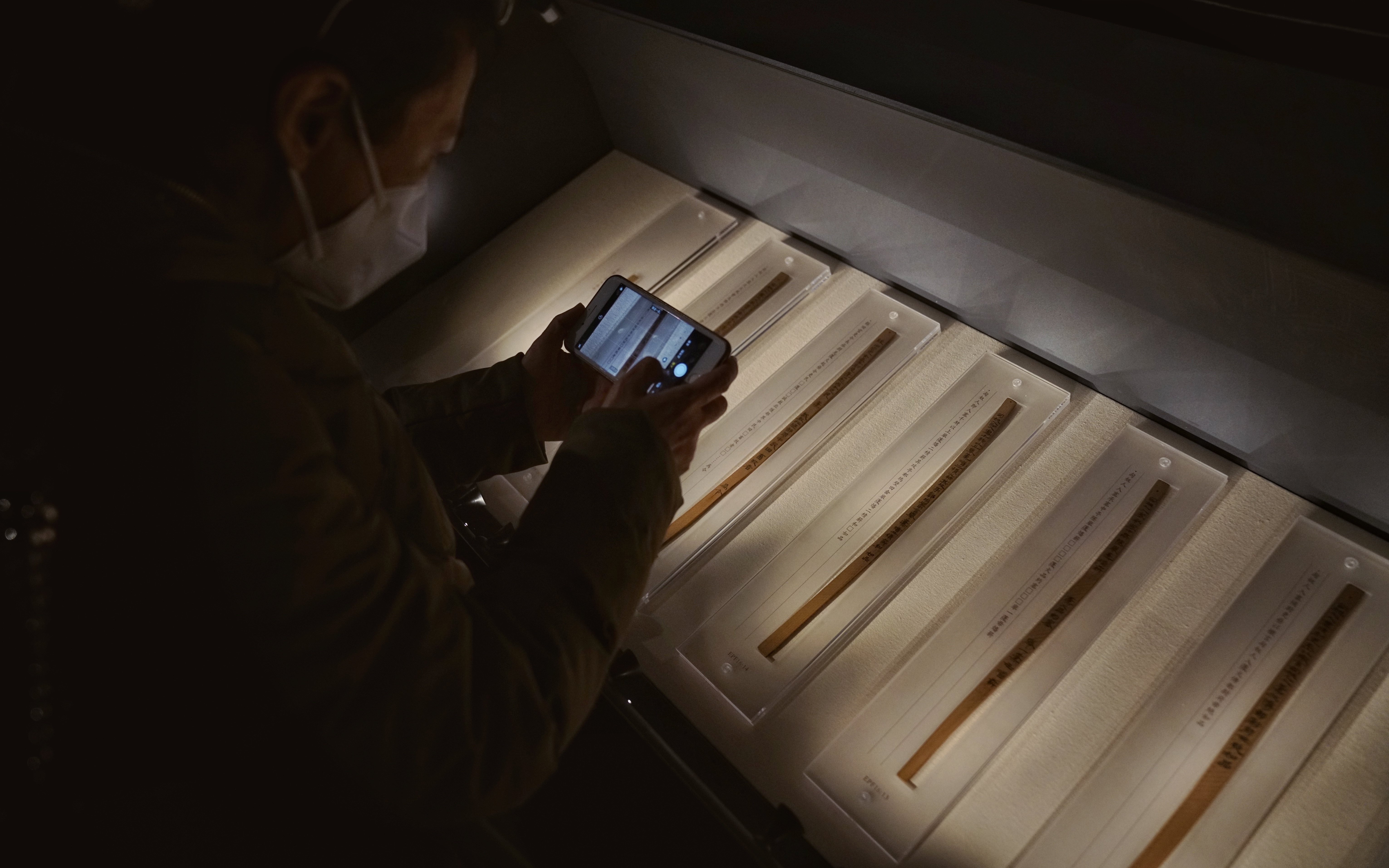 媒体记者拍摄甘肃简牍博物馆藏《塞上烽火品约》(仿制品)。新京报记者 薛珺 摄