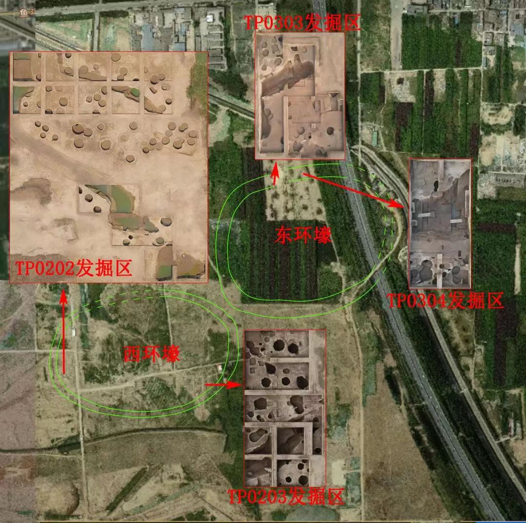 在东环壕北部中央发现有朱砂墓、夯土基址和大型地坑院建筑等。同时在遗址里面发现了当时人类生活使用的陶器、石器、骨器,通过植物考古学的浮选,还发现了当时人们生活所必需的粮食,包括黍水稻等等,这都是为展示当时人类生活的一个全方位的场景。特别是小麦的发现为了解小麦东传路线提供了明确的证据。